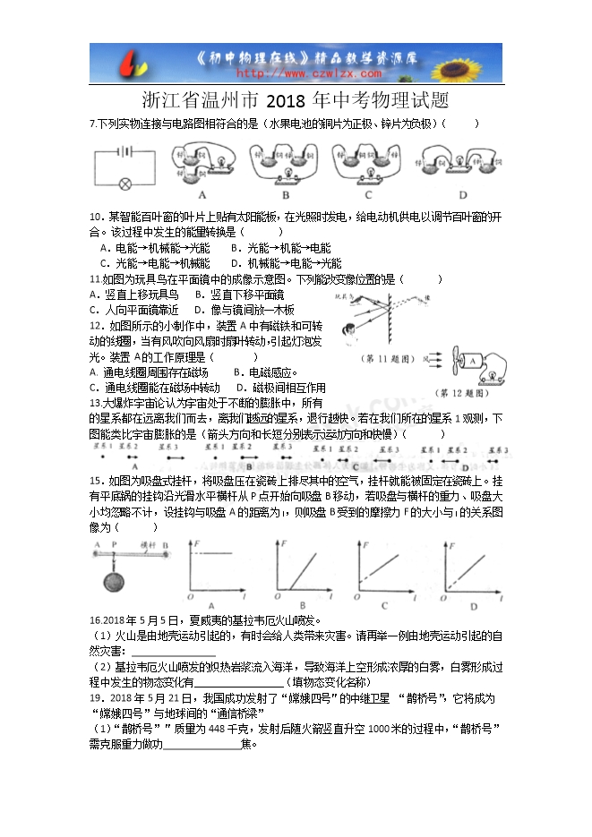 浙江省温州市2018年中考物理试题(word版,含答案)