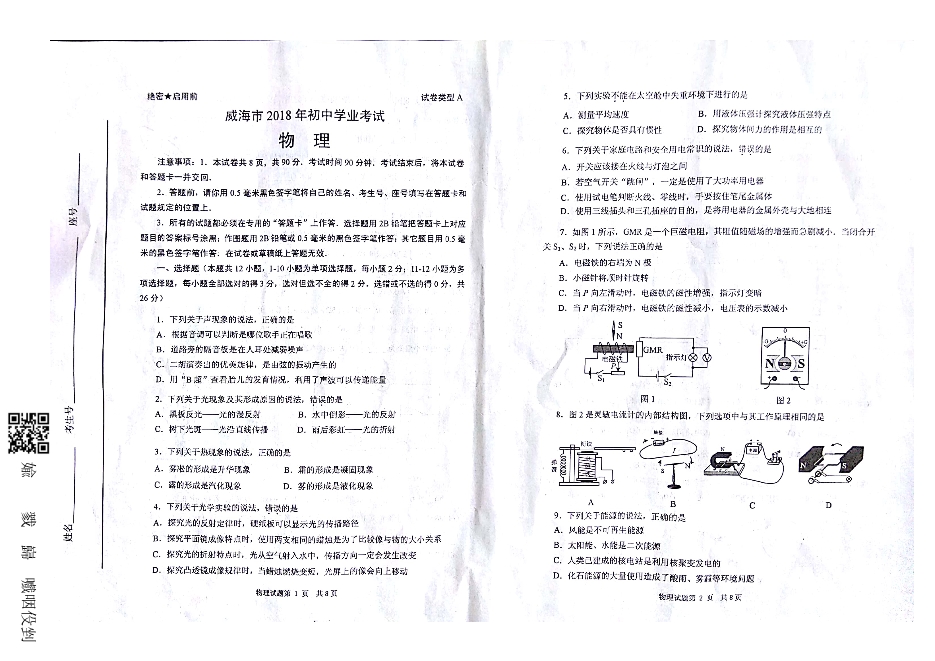 山东省威海市2018年初中学业考试(中考)物理试卷(PDF版 含答案)