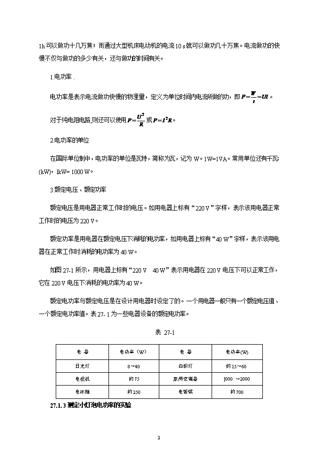 额定电功率与额定电压是在设计用电器时设定了的。一个用电器一般只有一个额定电压值、一个额定电功率值。表27- 1为一些电器设备的额定电功率。