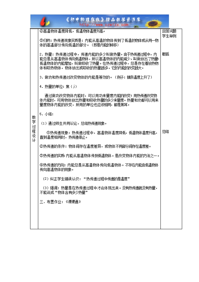 教科版九年级物理上册《1.2内能和热量》新版教学设计2