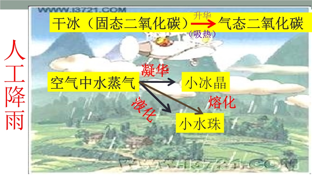 【内容简介】北师大版八年级物理上册《1.4升华和凝华》ppt课件共有12张幻灯片,由生活实例引入,讲授升华和凝华的概念,并举例说明,然后分析了人工降雨的原理,并附有相关例题详解。