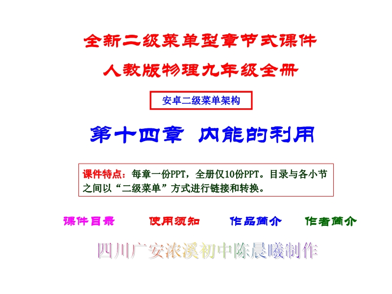 【内容简介】人教版物理课件:《第十四章 内能的利用》整章PPT课件+视频+flash,课件有81张幻灯片和3份视频.