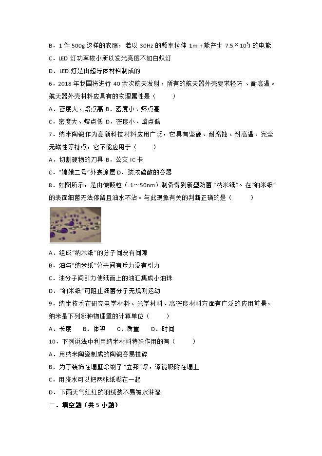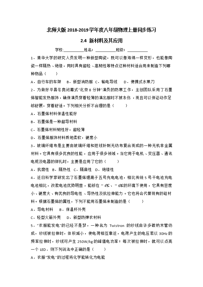 - 1284北师大版八年级上册物理《2.4新材料及其应用》测试题(附答案)