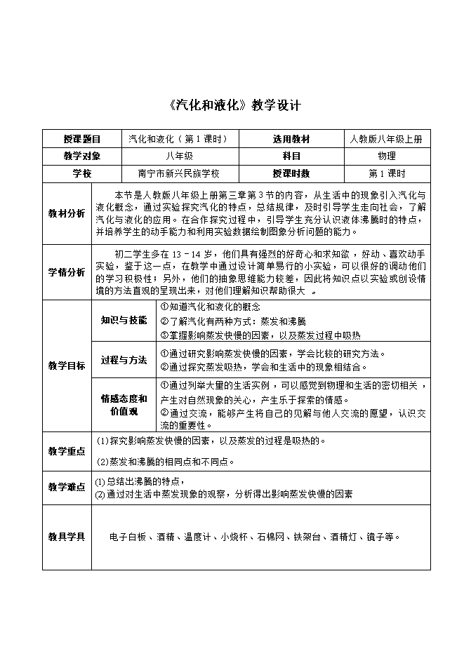南宁市新兴民族学校:人教版《3.3汽化和液化》课件+教案设计