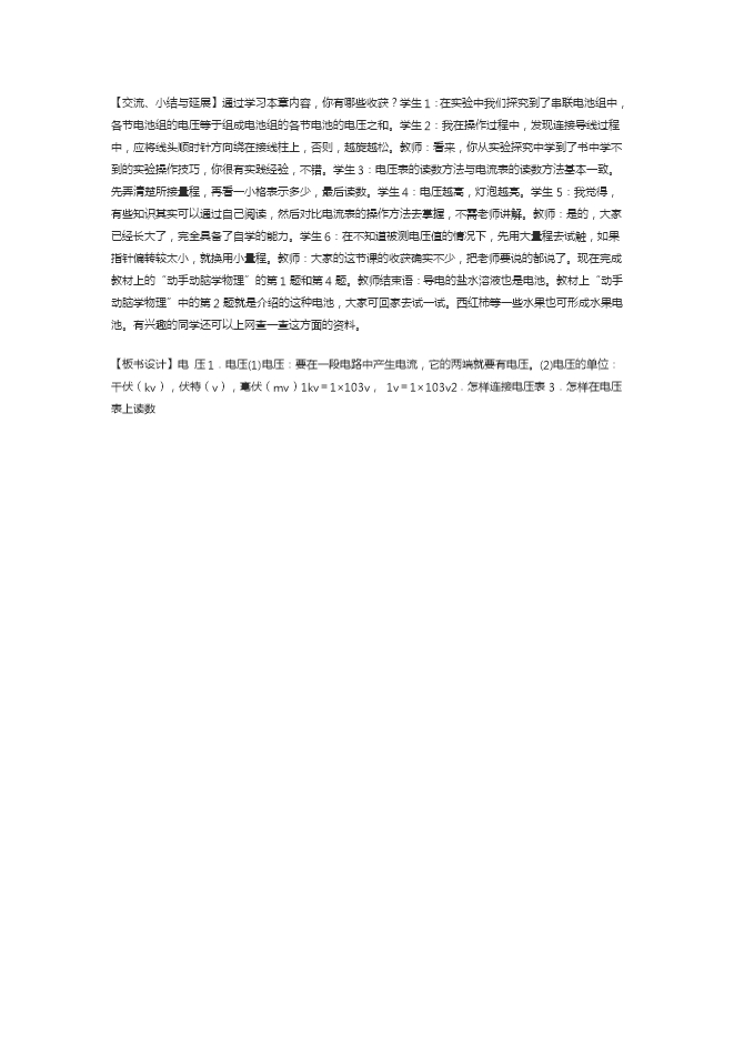 【内容简介】 本节内容由“电压”和“电压的测量”两部分构成。对于“电压”的认识,教材设置了“水果电池能够点亮发光二极管”这一出人意料的情景,让学生体会到水果在这里扮演了“电源”的角色,为二极管提供了“电压",从而引出本节的核心概念。不同电源提供不同电压,由此引出电压的高低和单位。”电压的测量“是通过引导学生仔细观察电压表和阅读电压表的使用说明,让学生总结得出电压表的连接方法和使用方法。因此,要充分发挥学生的主体作用,教师引领学生在已有的生活经验和知识基础的层面上进行实验探究,并凸显交流与合作的教学氛围,让学生在学习过程中,使用“移动实验室”来体验探究的愉悦,从而获得知识并树立足够的学习信心。