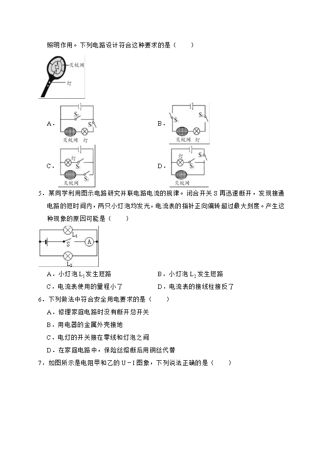 4.如图所示的电蚊拍,具有灭蚊和照明等功能。当开关Sl闭合、S2断开时,只有灭蚊网通电起到灭蚊作用;当开关Sl和S2都闭合时,灭蚊网与灯都通电同时起到灭蚊和照明作用。下列电路设计符合这种要求的是( )