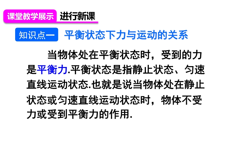 【内容简介】人教版八年级下册《8.2二力平衡》PPT课件,共有39张幻灯片。课件引导学生认识了什么是平衡状态、什么是平衡力,并引导学生通过实验探究了二力平衡的条件,讨论了二力平衡的应用.