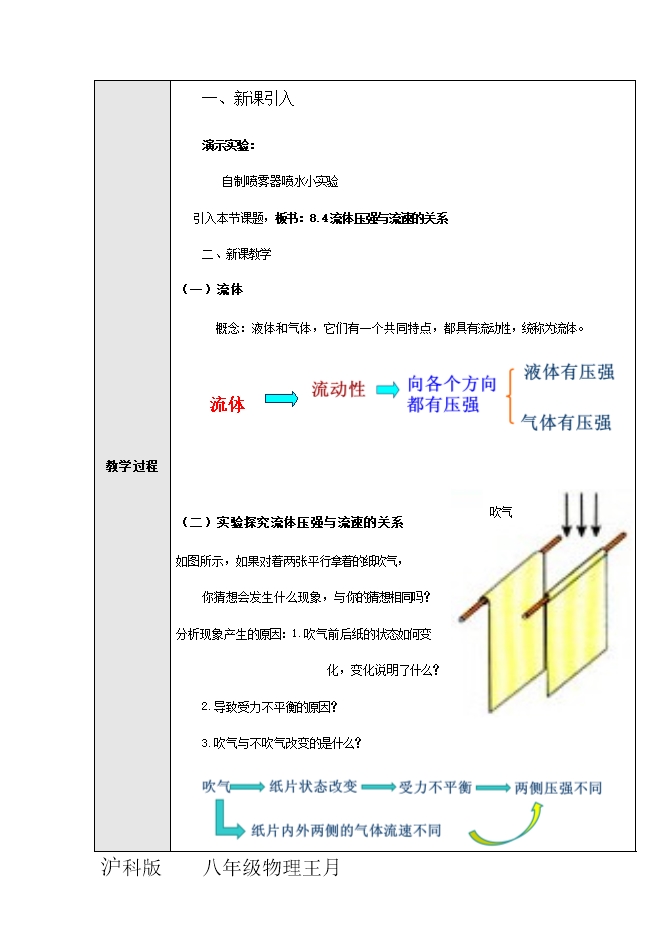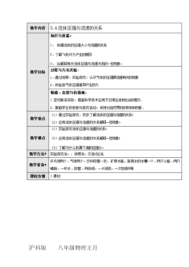 沪科版八年级物理《8.4流体压强与流速的关系》ppt课件+教案(市级优课)