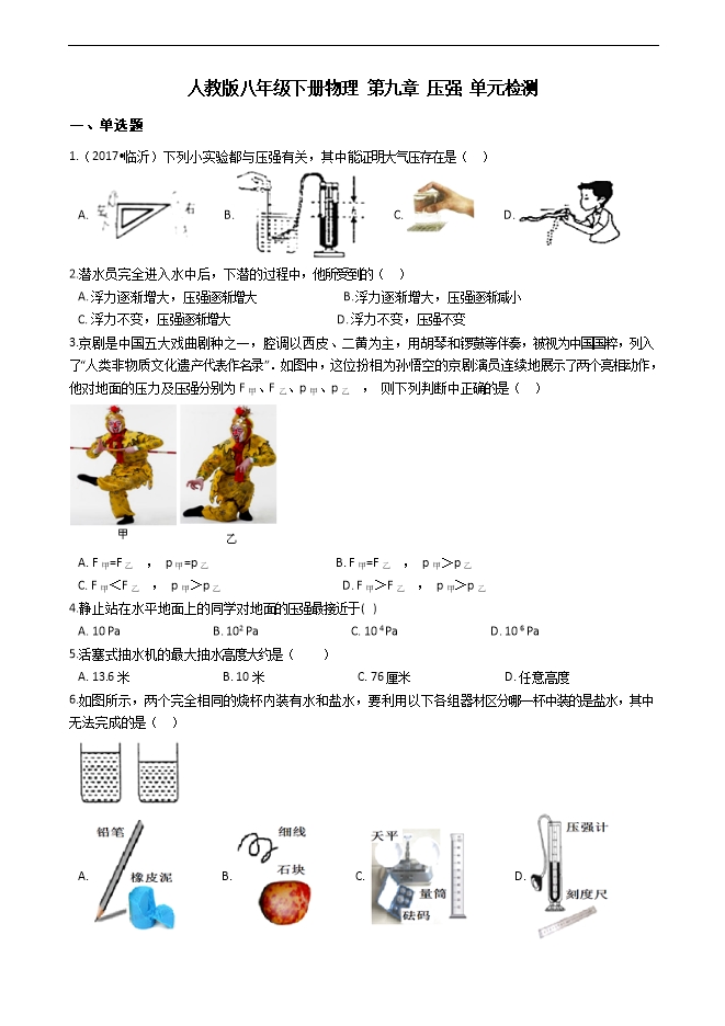 2018-2019人教版八年级下册物理《第九章 压强》单元检测题及答案