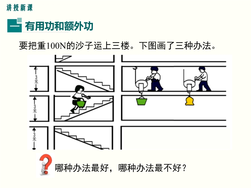 【内容简介】人教版:《12.3机械效率》PPT课件,共有31张幻灯片。课件从提出问题开始引导学生进入学习,让学生从具体的实例中认识了什么是有用功、什么是额外功、什么是总功,并总结了它们的关系,在此基础上,引导学生认识了机械效率的概念及意义,课件中有例题和习题。
