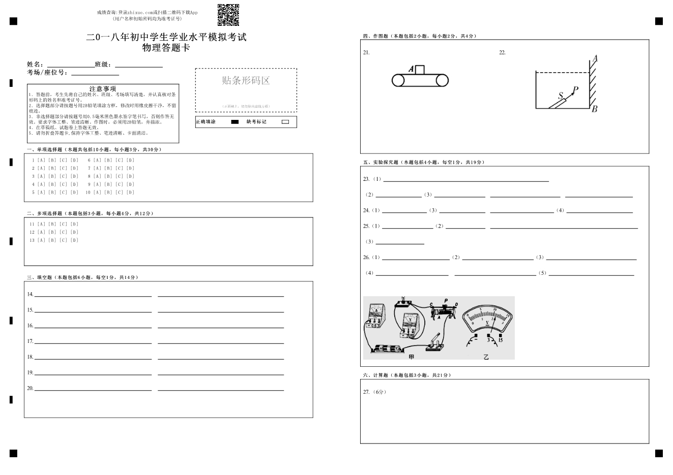 2018年山东省聊城开发区九年级第一次中考模拟物理试题及答案(附答题卡)