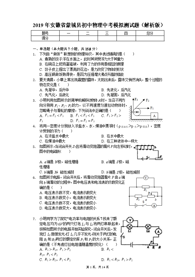 2019年安徽省蒙城县初中物理中考模拟测试题(二)(解析版)