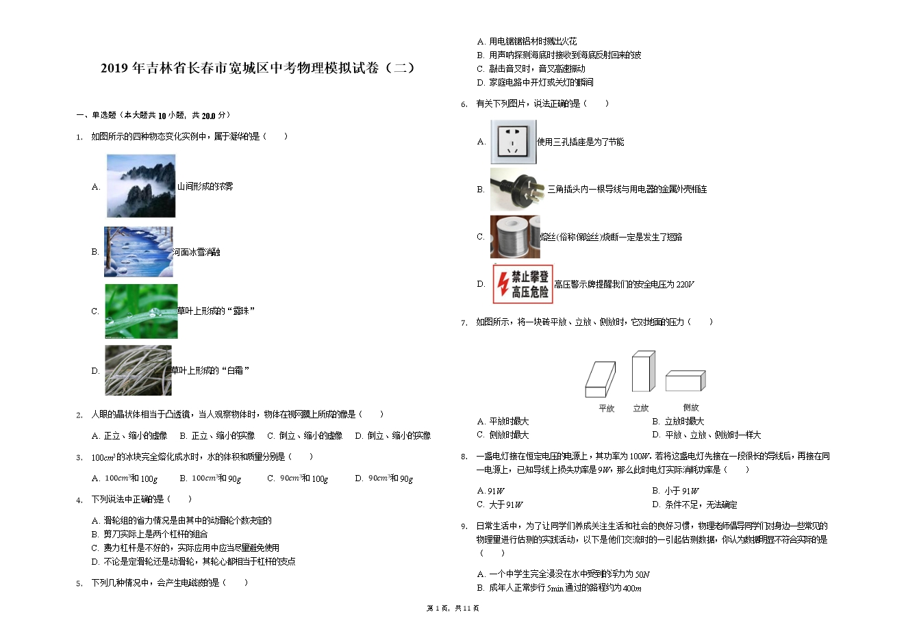 2019年吉林省长春市宽城区中考物理模拟试卷(二)(解析版)