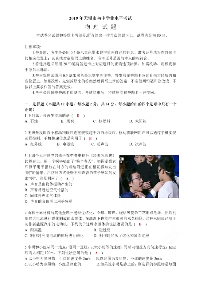 2019年江苏省无锡市中考物理试卷及答案(pdf版)