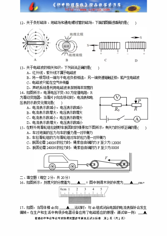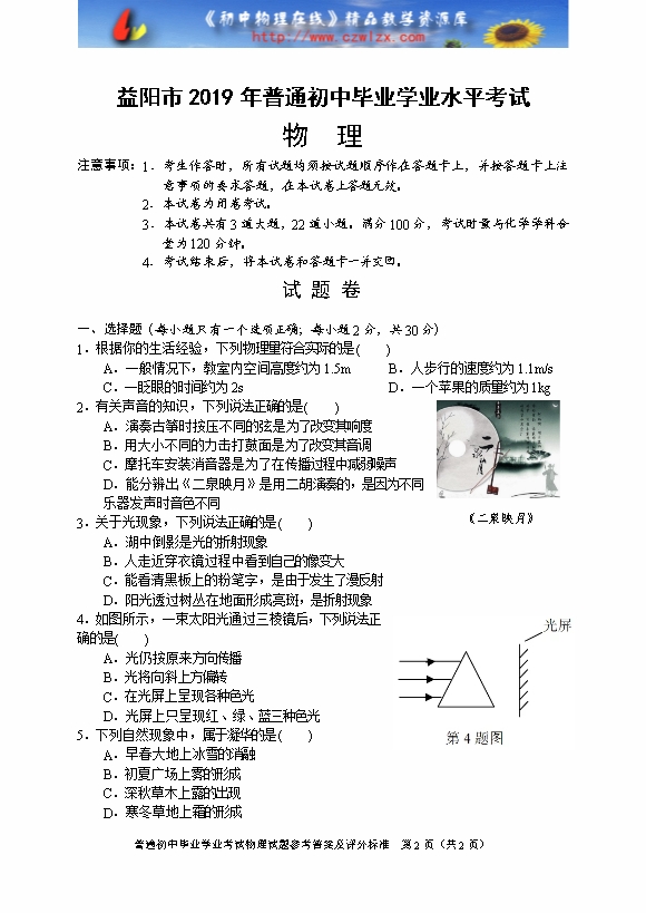 2019年湖南省益阳市普通初中学业水平考试物理试题卷及答案(word版)