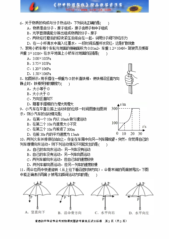 11.雨伞在雨中快速旋转(从上往下看沿逆时钟方向),伞骨末端的雨滴被甩出。下图中能正确表示雨滴P被甩出瞬间运动方向的是( )