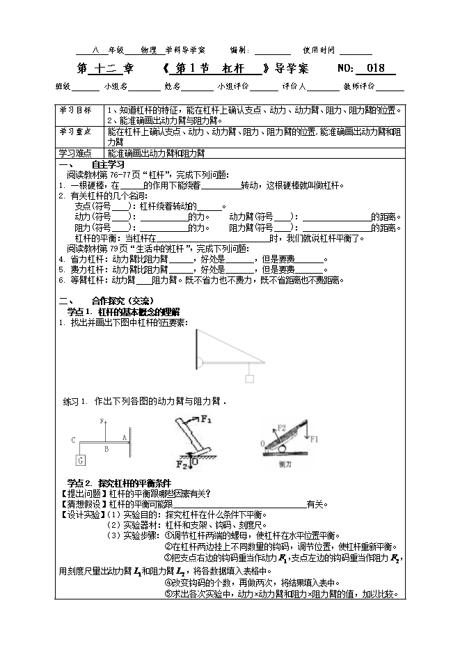 2019-2020学年度人教版八年级物理下册《第十二章 简单机械》导学案(共3份打包)
