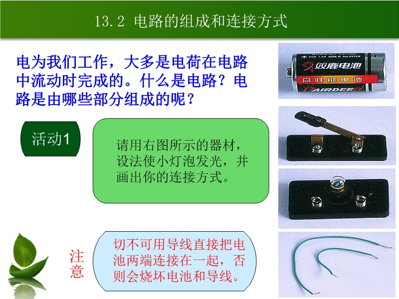 【内容简介】2019秋沪粤版九年级物理上册教学课件+教案:13.2电路的组成和连接方式