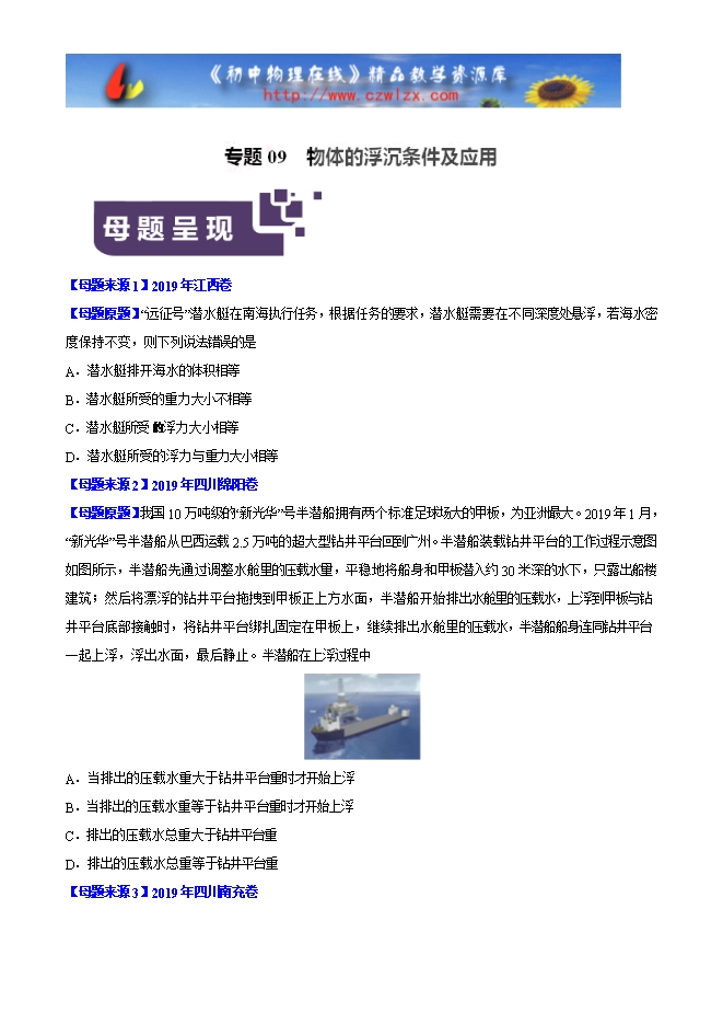 【内容简介】【母题来源1】2019年江西卷[来源:学科网]【母题原题】“远征号”潜水艇在南海执行任务,根据任务的要求,潜水艇需要在不同深度处悬浮,若海水密度保持不变,则下列说法错误的是A.潜水艇排开海水的体积相等B.潜水艇所受的重力大小不相等C.潜水艇所受浮力大小相等D.潜水艇所受的浮力与重力大小相等【母题来源2】2019年四川绵阳卷[来源:学科网]【母题原题】我国10万吨级的“新光华”号半潜船拥有两个标准足球场大的甲板,为亚洲最大。2019年1月,“新光华”号半潜船从巴西运载2.5万吨的超大型钻井平台回到广州。半潜船装载钻井平台的工作过程示意图如图所示,半潜船先通过调整水舱里的压载水量,平稳地将船身和甲板潜入约30米深的水下,只露出船楼建筑;然后将漂浮的钻井平台拖拽到甲板正上方水面,半潜船开始排出水舱里的压载水,上浮到甲板与钻井平台底部接触时,将钻井平台绑扎固定在甲板上,继续排出水舱里的压载水,半潜船船身连同钻井平台一起上浮,浮出水面,最后静止。半潜船在上浮过程中