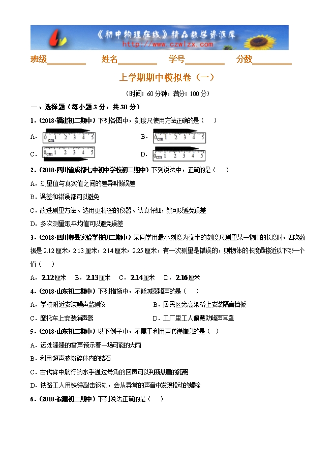 【内容简介】2019-2020学年八年级物理单元双基双测AB卷:上学期期中模拟卷(A卷基础篇)(沪粤版)