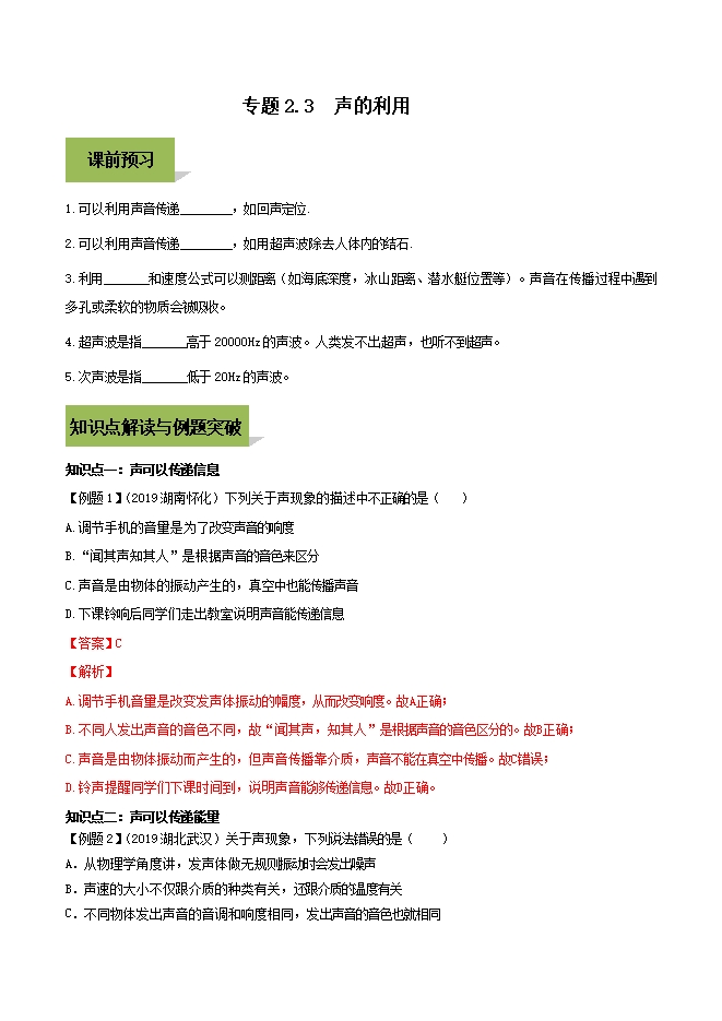 【内容简介】(人教版)2019-2020学年八年级上册物理精讲精练:专题2.3 声的利用