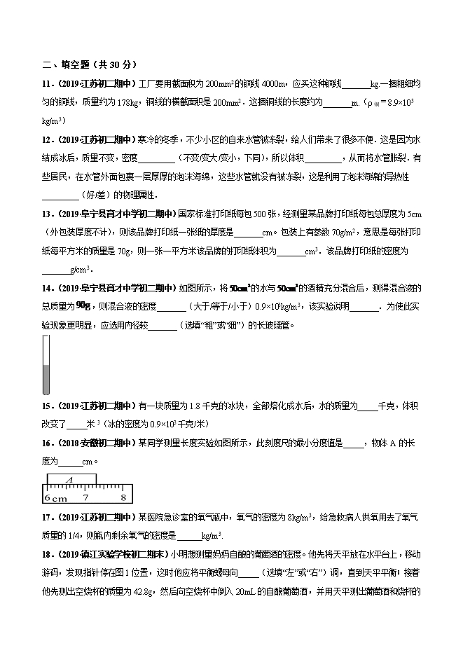 【内容简介】一、选择题(每小题3分,共30分)1.(2019·扬州中学教育集团树人学校初二期中)学习质量和密度的知识后,小明同学想用天平、量筒和水完成下列实践课题,你认为能够完成的是( )①测量牛奶的密度 ②鉴别金戒指的真伪 ③测定一捆铜导线的长度④鉴定铜球是空心的还是实心的 ⑤测定一大堆大头针的数目.A.①②③④⑤ B.①②④⑤ C.①②④ D.①②2.(2019·扬州中学教育集团树人学校初二期中)为了避免人体肩部受到伤害,专家建议人肩负的书包总质量不要超过人体质量的15%,根据建议,你估计中学生肩负的书包总质量通常不要超过( )A.9mg B.9g C.9kg D.9t3.(2019·江苏初二期中)小明用一个最多能装5kg水的塑料桶装满酱油,则桶内酱油的质量( )A.等于5kg B.大于5kg C.小于5kg D.无法确定4.(2019·江苏初二期中)量筒和液体的总质量m、液体的体积V的关系如图所示。则下列判断正确的是( )A.60 cm3的该液体质量为80 g B.量筒质量为40 gC.该液体密度为1.25 g/cm3 D.该液体密度为1.00 g/cm35.(2019·江苏初二期中)有A、B、C、三个由同种材料制成的金属球,它们的质量分别为128g、400g、60g,体积分别为16cm3、50cm3、12cm3.则以下说法正确的是( )A.C球一定为空心 B.A球和B球一定为实心 C.C球可能为空心 D.该材料的密度为5g/cm36.(2019·江苏初二期中)为测量某种液体的密度,小铭利用天平和量杯测量液体和操杯的总质量m及液体的体积V,得到了几组数据并绘出了m-V图像,如图所示。下列说法正确的是( )