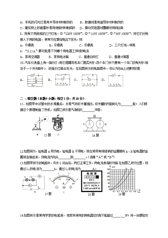 【内容简介】一、选择题(下列各题四个选项中只有一个符合题意,请将正确选项的字母填入答题卡,本题14个小题,每题3分,共30分)1.根据能量守恒定律,下列说法正确的是A.只要科技足够先进,不需要外界能量的永动机是可以制成的B.我们消耗了电能,电能就转化为其它形式的能量了C.能量是守恒的,世界不会有能源危机D.植物吸收太阳光进行光合作用将光能转化为内能2.我们通常吃的咸鸭蛋,其实是用鸭蛋腌制而成的。有的地方是将食盐和黄泥以适当比例混合后加水和成泥,裹在鸭蛋表面,十天或半月后鸭蛋就变咸了。下面分析正确的是A.此方法不能腌制鸡蛋 B.只有蛋壳有裂缝的蛋才能变咸C.此实例说明固体之间也能发生扩散 D.加黄土是为了腐蚀蛋壳,使蛋壳变薄3.下列说法正确的是A.0℃的冰熔化成0℃的水时,温度不变,内能不变B.发生热传递时,热量总是从内能大的物体传递给内能小的物体C.物体的比热容跟物体吸收和放出的热量多少有关D.水银的比热容比水的小,则相同质量的水银和水,升高相同的温度,水吸收的热量较多4.一单缸四冲程柴油机飞轮每分钟转1800圈,则该柴油机1秒钟对外做功的次数为A.15 B.60 C.450 D.900 5.在研究“磁极间相互作用的规律”时,某小组同学设计了如下四种方案,其中最合理的是A.两人各拿一块条形磁铁,并将各自的一个磁极相互靠近B.用一块条形磁铁的一个磁极靠近另一块条形磁铁中间C.将放在粗糙桌面上的两块条形磁铁的磁极相互靠近D.用条形磁铁的一个磁极靠近另一块用细线悬挂并静止的条形磁铁的一个磁极6.巨磁电阻效应是指某些材料的电阻在磁场中急剧减小的现象,如图是说明巨磁电特性原理的示意图,当巨磁电阻GMR旁磁场增大时其电阻值减小。闭合S1、S2后,下列说法正确的是A.电磁铁的右端是S极B.滑片P向左滑动时电流表的示数变大C.滑片P向左滑动时指示灯变暗D.滑片P向右滑动时电磁铁的磁