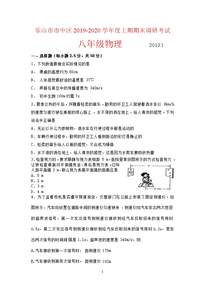 【内容简介】一、选择题(每小题2.5分,共50分)1.下列数值最接近实际情况的是A. 课桌的高度约为80cmB. 人体感觉最舒适的温度是37℃C. 声音在真空中的传播速度为340m/sD. 初中生跑100m约需7s2.夏季炎热的午后,伴随着轻柔的音乐,勤劳的环卫工人驾驶着洒水车以8km/h的速度匀速行驶在美丽的绿心路上,水不停的洒在地上,给人清凉的感觉。下列说法中正确是A.无论以什么为参照物,洒水车在行使过程中都是运动的B.车辆行使过程中,勤劳的环卫工人看到路边的彩灯是静止的C.轻柔的音乐给人以美的感觉,不会成为噪音D.水不停的洒在地上,给人清凉的感觉,这是因为水蒸发要吸收热量3.检查视力时,要求眼睛与视力表相距5 m。医院里常按图所示的方式检查视力,让被检查者面对平面镜而坐,身后是视力表。已知人距平面镜2 m,那么视力表离平面镜的距离应是 A.5 m B.2 m C.3 m D.4 m4.为了监督司机是否遵守限速规定,交管部门在公路上安装了固定测速仪。如图所示,汽车向放置在道路中间的测速仪匀速驶来,测速仪向汽车发出两次短促的超声波信号,第一次发出信号到测速仪接收到经汽车反射回来的信号用时0.5s,第二次发出信号到测速仪接收到经汽车反射回来的信号用时0.3s,若发出两次信号的时间间隔是1.ls,超声波的速度是340m/s,则A.汽车接收到第一次信号时,距测速仪170m