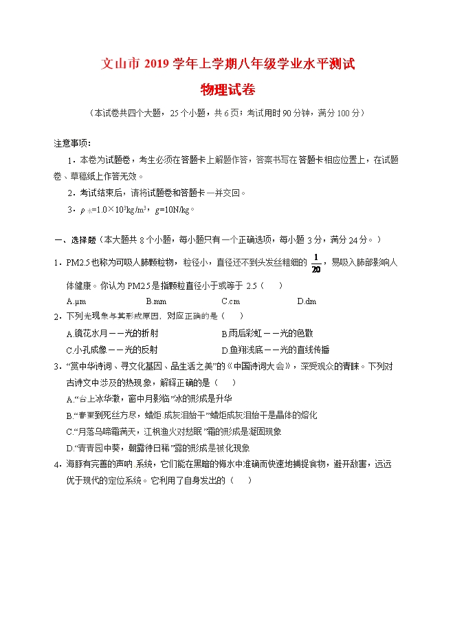 【内容简介】注意事项:1.本卷为试题卷,考生必须在答题卡上解题作答,答案书写在答题卡相应位置上,在试题卷、草稿纸上作答无效。2.考试结束后,请将试题卷和答题卡一并交回。3.ρ水=1.0×103kg/m3,g=10N/kg。 一、选择题(本大题共8个小题,每小题只有一个正确选项,每小题3分,满分24分。)1.PM2.5也称为可吸人肺颗粒物,粒径小,直径还不到头发丝粗细的 ,易吸入肺部影响人体健康。你认为PM2.5是指颗粒直径小于或等于2.5( )A.µm B.mm C.cm D.dm2.下列光现象与其形成原因,对应正确的是( )A.镜花水月——光的折射 B.雨后彩虹——光的色散C.小孔成像——光的反射 D.鱼翔浅底——光的直线传播3.“赏中华诗词、寻文化基因、品生活之美”的《中国诗词大会》,深受观众的青睐。下列对古诗文中涉及的热现象,解释正确的是( )A.“台上冰华澈,窗中月影临”冰的形成是升华B.“春蚕到死丝方尽,蜡炬成灰泪始干”蜡炬成灰泪始干是晶体的熔化C.“月落乌啼霜满天,江枫渔火对愁眠”霜的形成是凝固现象D.“青青园中葵,朝露待日稀”露的形成是被化现象4.海豚有完善的声呐系统,它们能在黑暗的悔水中准确而快速地捕捉食物,避开敌害,远远优于现代的定位系统。它利用了自身发出的( )A.光波 B.水波 C.次声波 D.超声波5.下列措施不能达到减弱|噪声目的的是( )A.摩托车的排气管上安装消声器 B.机场人员佩戴有耳罩的头盔C.机动车辆在市内严禁鸣笛 D.街头设置噪声监测仪 6.移动支付已经逐渐成为人们常用的支付手段。2018年8月18日,支忖宝向外界宣布,其刷脸支付功能已经成熟,付款时顾客只需面对付款设备,该设备就会利用摄像头自动进行人脸识别,识别成功即表示付款完成。下列关于该设备摄像头的说法错误的是( )A.该摄像头相当于凸透镜,中间厚边缘部B.人脸到镜头的距离只要大于一倍焦距就能成清晰的像C.这种镜头能使光发生偏折,对光线有会聚作用D.这种镜头成像原理与照相机成像的原理相同[来源:Z.xx.k.Com]7.今年冬天特别冷,早晨起来看到植物上有白色的霜,形成了冬天一道凯丽的景色。霜是空气中的水蒸气( )A.凝固而成的 B.液化而成的C.凝华而成的 D.先液化,后凝固而成的8.有两个完全相同的瓶子,一个装满水后质量为320g,一个装满酒精后质量是280g,那么( )(ρ水=1.0×103kg/m3,ρ酒精=0.8×103kg/m3)A.瓶子的质量是100g B.瓶子的质量是40gC.瓶子的容积是200mL D.瓶子的容积是280mL