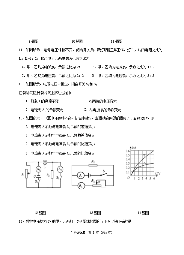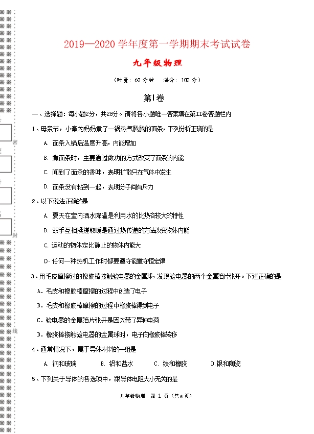 【内容简介】一、选择题:每小题2分,共28分。请将各小题唯一答案填在第II卷答题栏内1、母亲节,小秦为妈妈煮了一锅热气腾腾的面条,下列分析正确的是 A. 面条入锅后温度升高,内能增加B. 煮面条时,主要通过做功的方式改变了面条的内能C. 闻到了面条的香味,表明扩散只在气体中发生D. 面条没有粘到一起,表明分子间有斥力2、以下说法正确的是 A. 夏天在室内洒水降温是利用水的比热容较大的特性B. 双手互相揉搓取暖是通过热传递的方法改变物体内能C. 运动的物体定比静止的物体内能大D 任何一种热机工作时都要遵守能量守恒定律3、用毛皮摩擦过的橡胶棒接触验电器的金属球,发现验电器的两个金属箔片张开。下述正确的是 A.毛皮和橡胶棒摩擦的过程中创造了电子 B.毛皮和橡胶棒摩擦的过程中橡胶棒得到电子C.验电器的金属箔片张开是因为带了异种电荷D.橡胶棒接触验电器的金属球时,电子向橡胶棒转移4、通常情况下,属于导体材料的一组是 A. 铜和玻璃 B. 铝和盐水 C. 铁和橡胶 D.银和陶瓷 5、下列关于导体的各选项中,跟导体电阻大小无关的是 A. 长度 B. 材料 C. 电流 D. 横截面积6、有甲、乙、丙、丁四个轻质小球,乙带正电,把四个小球分别两两靠近时,发现乙吸引甲,甲吸引丙,丁排斥丙,则甲球 A. 一定带负电 B. 一定带正电 C. 一定不带电 D. 可能带负电,也可能不带电7、汽车在转向前,司机会拨动方向盘旁边横杆,汽车同侧的前后两个转向灯就会同时闪亮、同时熄灭,下列说法正确的是 A. 两灯中的电流一定相等 B. 前后两个转向灯一定是串联C. 前后两个转向灯一定是并联 D. 司机拨动的横杆相当于电路中的开关8、如图所示,闭合开关S,发现灯泡L1亮、L2不亮;调节变阻器滑片P,L1变亮,L2始终不亮,出现这一现象原因可能是 A. 灯泡L2短路 B. 灯泡L2断路 C. 滑动变阻器断路 D. 滑动变阻器短路