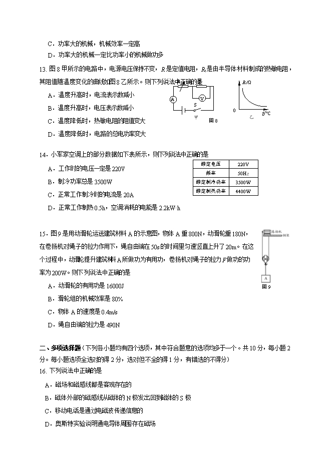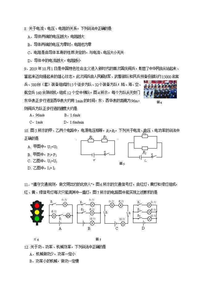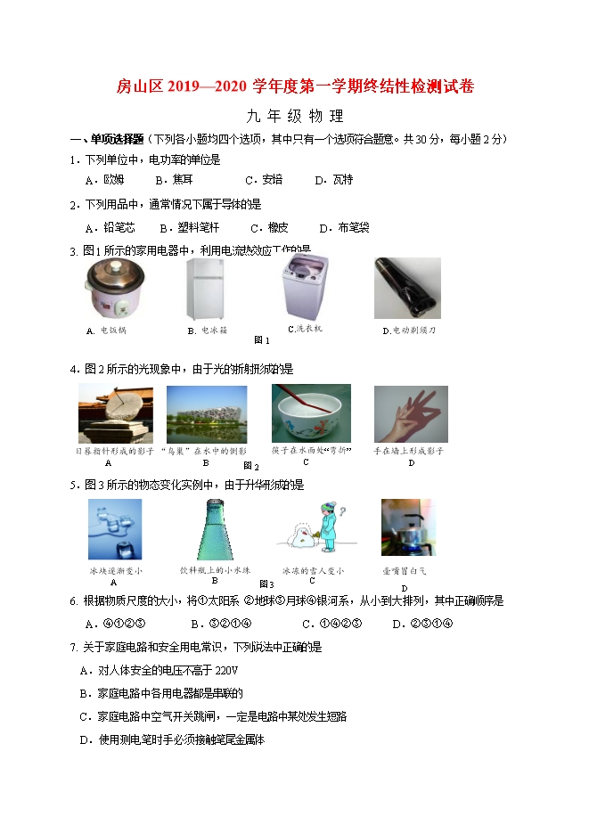 【内容简介】一、单项选择题(下列各小题均四个选项,其中只有一个选项符合题意。共30分,每小题2分)1.下列单位中,电功率的单位是 A.欧姆 B.焦耳 C.安培 D.瓦特2.下列用品中,通常情况下属于导体的是 A.铅笔芯 B.塑料笔杆 C.橡皮 D.布笔袋3.图1所示的家用电器中,利用电流热效应工作的是 4.图2所示的光现象中,由于光的折射形成的是 5.图3所示的物态变化实例中,由于升华形成的是 6. 根据物质尺度的大小,将①太阳系②地球③月球④银河系,从小到大排列,其中正确顺序是 A.④①②③ B.③②①④ C.①④②③ D.②③①④7. 关于家庭电路和安全用电常识,下列说法中正确的是 A.对人体安全的电压不高于220V B.家庭电路中各用电器都是串联的 C.家庭电路中空气开关跳闸,一定是电路中某处发生短路 D.使用测电笔时手必须接触笔尾金属体