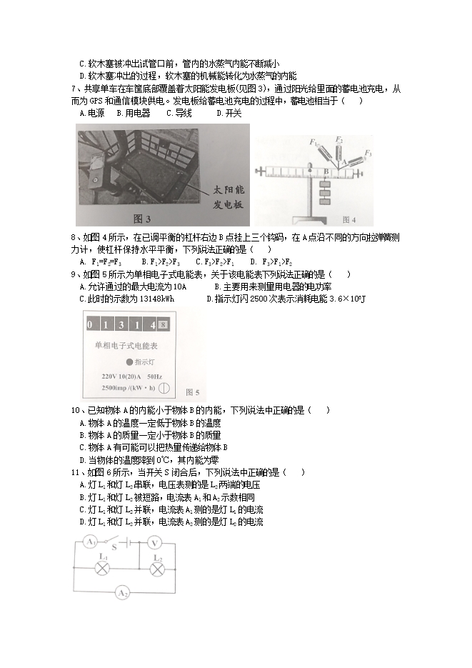 【内容简介】第一部分(共36分) 一、选择题。(每小题3分,共36分)(每小题给出的四个选项中,只有一个是正确的,请把正确的答案选出来)1、原子由哪些粒子构成( )A.原子核和电子 B.质子和中子 C.中子和电子 D.原子核和分子2、以下说法正确的是( )A.分子之间不能同时存在引力和斥力 B.扩散现象只能发生在气体之间C.温度越高,分子热运动越剧烈 D.尘土飞扬,说明分子在不停运动3、有甲、乙、丙三个带电体,甲物体吸引乙物体,乙物体排斥丙物体。对于这三个物体的带电情况,下列说法正确的是( )A.甲一定带正电,乙和丙一定带负电 B.甲和丙一定带异种电荷C.甲一定带负电,乙和丙一定带正电 D.乙和丙一定带异种电荷4、图1展示了其他条件都相同时,不同材料在导电性能上的排序,从上至下,材料的导电性能依次减弱。另外,科学家发现,铝在-271.76℃以下,电阻可以变为零,这就是超导现象。超导材料可以大大降低电能损耗。下列说法中错误的是( )A.从图1可得银的导电性能比铁好B.从图1可得盐水的导电性比酸溶液差C.同种材料的导电性是不会改变的D.超导材料可运用在输送电能 5、以下行为符合安全用电原则和有节约用电意识的是( )A.多个大功率用电器同时使用一个插座 B.不断开开关直接更换灯泡 C.做课间操的时候把教室的灯熄灭 D.炎热的夏天,把家里的空调调到18℃6、如图2所示,给试管里的水加热,水沸腾后,软木塞被冲出试管口,试管口出现白雾,下列说法正确的是( )A.试管口出现的白雾是液态B.用酒精灯加热水,主要是通过做功的方式改变水的内能C.软木塞被冲出试管口前,管内的水蒸气内能不断减小D.软木塞冲出的过程,软木塞的机械能转化为水蒸气的内能7、共享单车在车筐底部覆盖着太阳能发电板(见图3),通过阳光给里面的蓄电池充电,从而为GPS和通信模块供电。发电板给蓄电池充电的过程中,蓄电池相当于( )A.电源 B.用电器 C.导线 D.开关 8、如图4所示,在已调平衡的杠杆右边B点挂上三个钩码,在A点沿不同的方向拉弹簧测力计,使杠杆保持水平平衡,下列说法正确的是( )A. F1=F2=F3 B.F1>F2>F3 C.F3>F2>F1 D. F3>F1>F29、如图5所示为单相电子式电能表,关于该电能表下列说法正确的是( )A.允许通过的最大电流为10A B.主要用来测量用电器的电功率 C.此时的示数为13148kWh D.指示灯闪2500次表示消耗电能3.6×106J