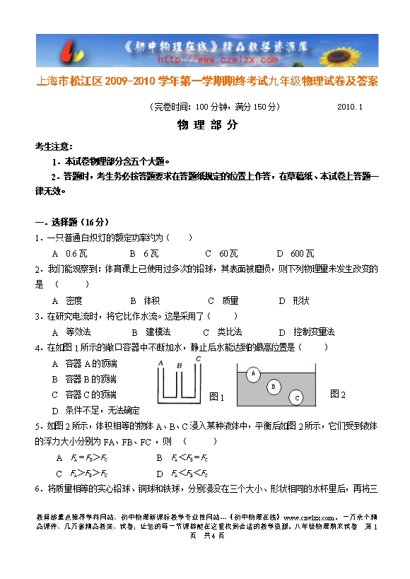 上海市松江区2009-2010学年第一学期期终考试九年级物理试卷及答案