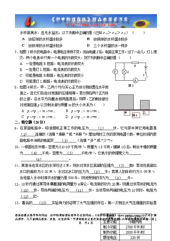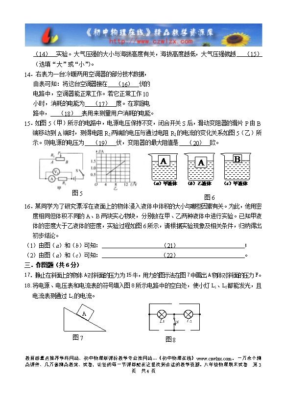 【内容简介】一.选择题(16分) 1.一只普通白炽灯的额定功率约为( ) A 0.6瓦 B 6瓦 C 60瓦 D 600瓦 2.我们能观察到:体育课上已使用过多次的铅球,其表面被磨损,则下列物理量未发生改变的是 ( ) A 密度 B 体积 C 质量 D 形状 3.在研究电流时,将它比作水流。这是采用了( ) A 等效法 B 建模法 C 类比法 D 控制变量法 4.在如图1所示的敞口容器中不断加水,静止后水能达到的最高位置是( )   A 容器A的顶端   B 容器B的顶端   C 容器C的顶端   D 条件不足,无法确定 5.如图2所示,体积相等的物体A、B、C浸入某种液体中,平衡后如图2所示,它们受到液体的浮力大小分别为FA、FB、FC ,则 (   ) A FA=FB>FC B FA<FB=FC C FA>FB>FC D FA<FB<FC 6.将质量相等的实心铅球、铜球和铁球,分别浸没在三个大小、形状相同的水杯里后,再将三水杯装满水,且无水溢出,以下判断中正确的是(已知ρ铅>ρ铜>ρ铁) ( ) A 放铅球的水杯盛水较多    B 放铜球的水杯盛水较多      C 放铁球的水杯盛水较多    D 三个水杯盛的水一样多 7.如图3所示的电路中,电源电压保持不变。闭合电键S后,电路正常工作。过了一会儿,灯L熄灭,两个电表中只有一个电表的示数变大,则下列判断中正确的是 ( ) A 一定是电阻R短路,电流表的示数变大 B 一定是灯L短路,电流表的示数变大 C 可能是电阻R断路,电压表的示数变小 D 可能是灯L断路,电流表的示数变小 8.如图4所示,甲、乙两个均匀实心正方体分别放置在水平地 面上,且它们各自对地面的压强相等。若分别在两个正方体 的上部,沿水平方向截去相同高度后,则甲、乙的剩余部分 对地面压强p以及剩余部分质量m的大小关系为( ) A p甲m乙 C p甲>p乙,m甲>m乙 D p甲>p乙,m甲=m乙 二.填空题(26分) 9.在家庭电路中,吸油烟机正常工作的电压为 (1) 伏,它与家中其它用电器是 (2) 连接的(选填“串联”或“并联”);增加同时工作的家用电器个数,单位时间内家庭电路中消耗的电能变 (3) (选填“多”或“少”)。 10.一根圆柱形木棒,密度为0.6×103千克/米3,质量为1.8千克。锯掉1/3后,剩余木棒的质量为 (4) 千克,密度为 (5) 千克/米3,它表示的物理意义为 (6) 。 11.某游泳池深水区的水深可达2米,则水对深水区底部的压强为 (7) 帕;若该处底部出水口的面积为0.02米2,水对出水口的压力为 (8) 牛。若某人的体积约为0.05米3,当他潜入水中时排开水的重力是500牛,则他受到的浮力为 (9) 牛。 12.10秒内通过某导体横截面的电荷量为4库仑,电流做的功为20焦,则通过该导体的电流为 (10) 安,导体两端的电压为 (11) 伏。当该导体两端的电压为10伏时,电阻为 (12) 欧。 13.著名的 (13) 实验有力的证明了大气压强的存在,第一次测出大气压强值的实验是 (14) 实验。大气压强的大小与海拔高度有关,海拔高度越低,大气压强就越 (15) (选填“大”或“小”)。 ........ ? ? ?