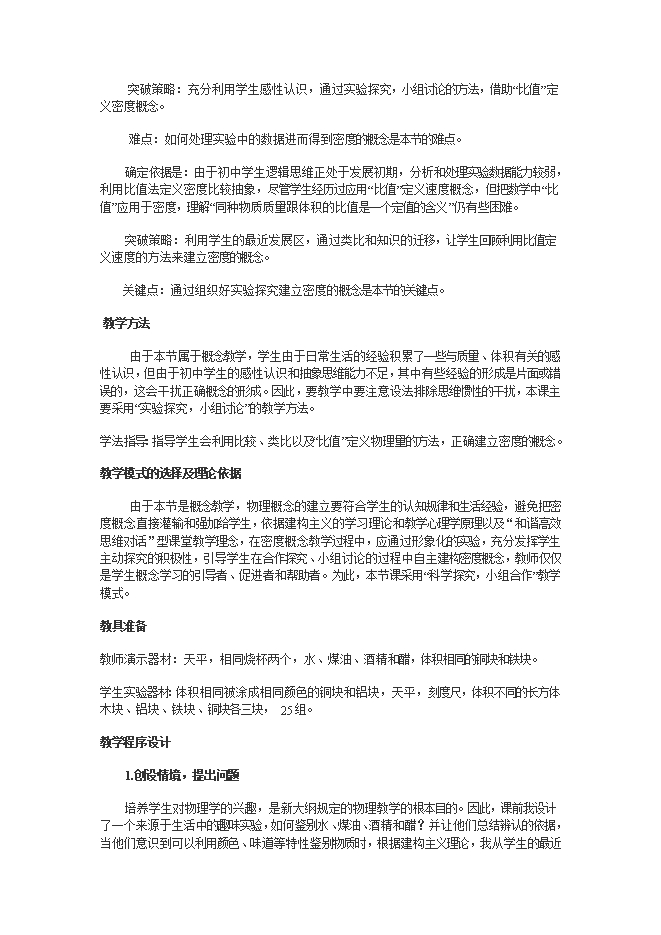 确定依据是:密度知识比较抽象,依据“大纲”要求,它不仅是初中物理教学的重点之一,在教材中承上启下,是进一步学习必备的基础性、前提性知识,而且它在一个生产、生活中应用十分广泛。