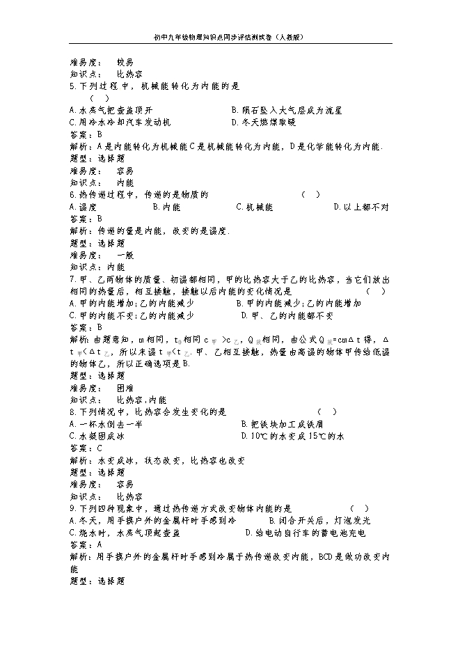 【内容简介】1.有关分子热运动,下列说法正确的是 ( ) A.液体很难被压缩,说明分子间有引力B.用手捏海绵,海绵的体积变小了,说明分子间有间隙 C.有霾天气大量极细微的尘粒悬浮在空中,说明分子在做无规则运动 D.在做墨水滴入水中的扩散实验中,我们看不到墨水的分子在运动答案:D解析:由分子运动理论知:液体很难被压缩,说明分子间存在斥力,A选项错;用手捏海绵,海绵的体积变小了,是力改变物体形状的作用效果,B选项错;有霾天气大量极细微的尘粒悬浮在空中是一种机械运动,C选项错;墨水滴入水中是一种扩散现象,是分子在做无规则运动形成的,分子大小的数量级为10-10 m,直接用肉眼是看不到墨水的分子在运动的,D选项正确.题型:选择题难易度: 容易知识点: 分子热运动2.下列事例中,用做功的方法使物体内能的增加的是 ( ) A.用热水淋浴后全身感到暖和 B.冬天对手“哈气”后感到暖和 C.冬天两手互相摩擦后,手感到暖和 D.冬天在房间内用暖气取暖,全身感到暖和 答案:C解析:其它选项都是用热传递的方式改变物体内能的. 题型:选择题难易度: 容易知识点: 内能