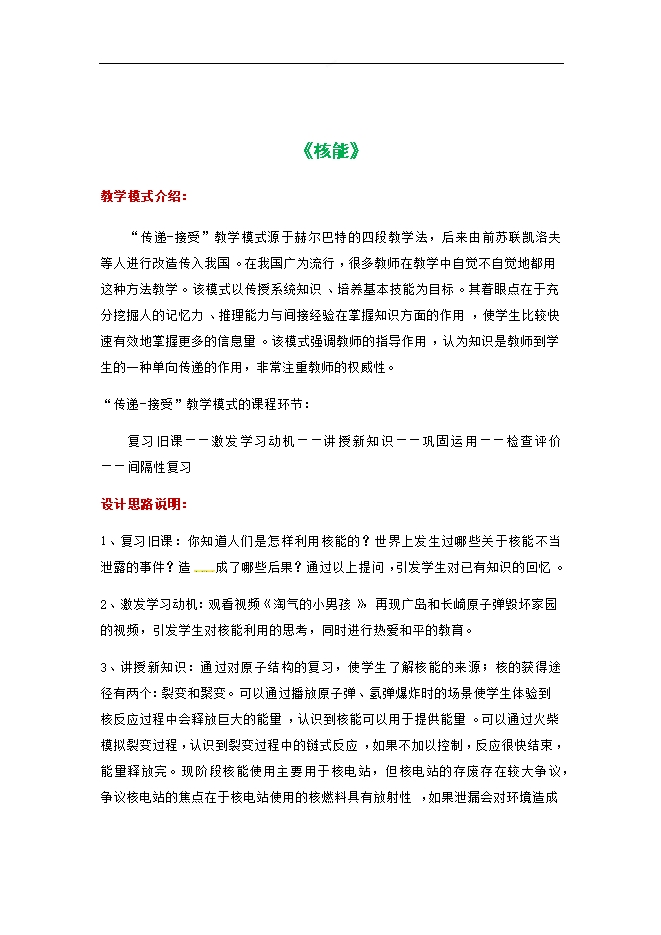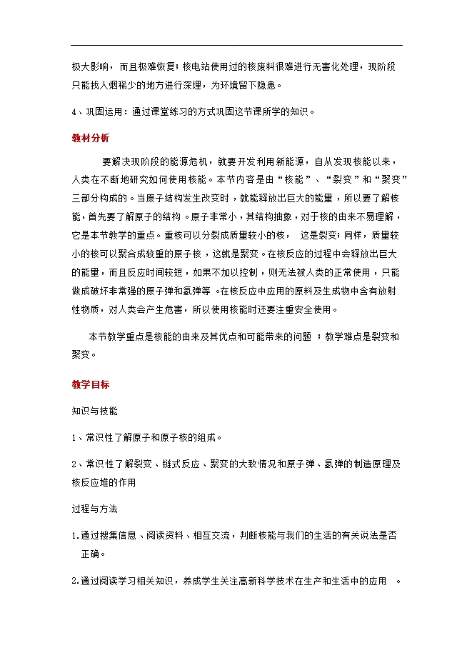 【内容简介】要解决现阶段的能源危机,就要开发利用新能源,自从发现核能以来,人类在不断地研究如何使用核能。本节内容是由“核能”、“裂变”和“聚变”三部分构成的。当原子结构发生改变时,就能释放出巨大的能量,所以要了解核能,首先要了解原子的结构。原子非常小,其结构抽象,对于核的由来不易理解,它是本节教学的重点。重核可以分裂成质量较小的核,这是裂变;同样,质量较小的核可以聚合成较重的原子核,这就是聚变。在核反应的过程中会释放出巨大的能量,而且反应时间较短,如果不加以控制,则无法被人类的正常使用,只能做成破坏非常强的原子弹和氢弹等。在核反应中应用的原料及生成物中含有放射性物质,对人类会产生危害,所以使用核能时还要注重安全使用。
