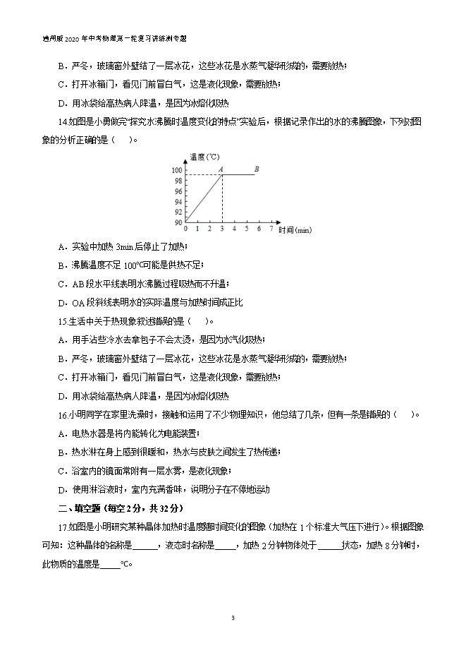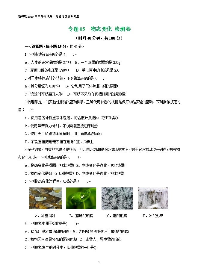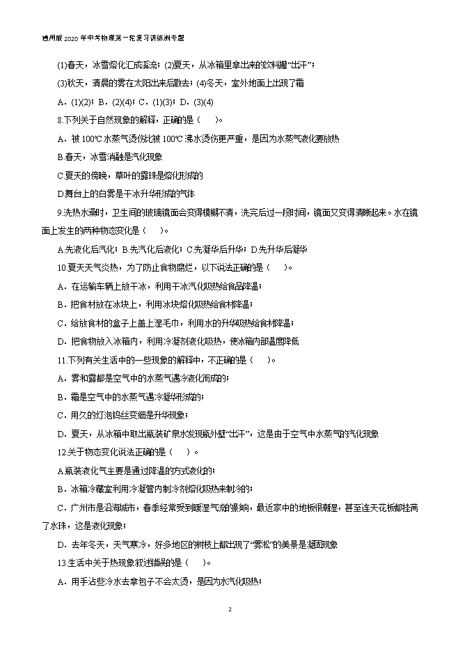 【内容简介】7.下列现象发生的过程中,吸收热量的一组是( )。(1)春天,冰雪熔化汇成溪流;(2)夏天,从冰箱里拿出来的饮料罐“出汗”;(3)秋天,清晨的雾在太阳出来后散去;(4)冬天,室外地面上出现了霜A.(1)(2);B.(2)(4);C.(1)(3);D.(3)(4)【答案】C。【解析】(1)春天,冰雪熔化汇成溪流,属于熔化,吸热;(2)夏天,从冰箱里拿出来的饮料罐“出汗”属于液化现象,放热;(3)秋天,清晨的雾在太阳出来后散去,属于汽化,吸热;(4)冬天,室外地面上出现了霜,属于凝华,放热。故,吸热的是(1)、(3),正确答案是C。8.下列关于自然现象的解释,正确的是( )。A.被100ºC水蒸气烫伤比被100ºC沸水烫伤更严重,是因为水蒸气液化要放热B.春天,冰雪消融是汽化现象C.夏天的傍晚,草叶的露珠是熔化形成的D.舞台上的白雾是干冰升华形成的气体【答案】A。【解析】被100ºC水蒸气烫伤比被100ºC沸水烫伤更严重,是因为水蒸气液化要放热,是正确的。春天,冰雪消融是熔化现象,而不是汽化现象,故B错。夏天的傍晚,草叶的露珠是水蒸气遇冷液化形成的,而不是熔化形成的,故C错。舞台上的白雾是干冰升华吸热,使空气温度下降,水蒸气遇冷变成小水滴形成的,故D错。正确答案是A。........