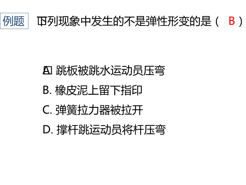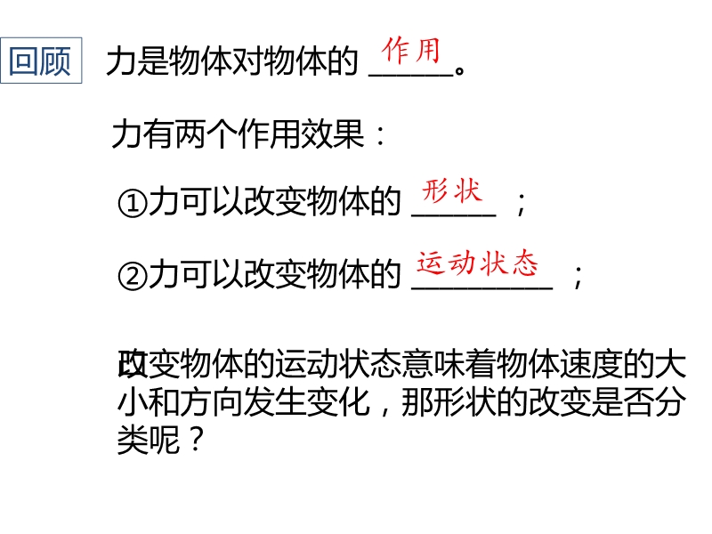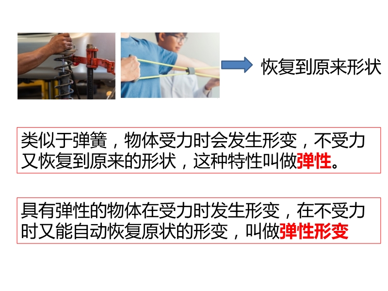 【内容简介】为什么撑杆跳比跳高的世界纪录高很多呢?力是物体对物体的 ______改变物体的运动状态意味着物体速度的大小和方向发生变化,那形状的改变是否分类呢?类似于弹簧,物体受力时会发生形变,不受力又恢复到原来的形状,这种特性叫做弹性。物体在受力时发生形变,在不受力时不能自动恢复原状的形变,叫做塑性形变。物体由于发生弹性形变而产生的力叫做弹力。产生弹力的条件:①两物体直接接触;②物体间有挤压。由于有些形变程度过小,人眼无法直接观察到,这时可以用弹力的产生条件判断两个物体是否有弹力的作用,就知道是否有形变产生。桌子对杯子有支持力的作用,这个力的施力物体是桌子,从性质上属于弹力,是由桌子的弹性形变产生的。杯子对桌子有压力的作用。这个力的施力物体是杯子,力的性质属于弹力,是由杯子的弹性形变产生的。.........