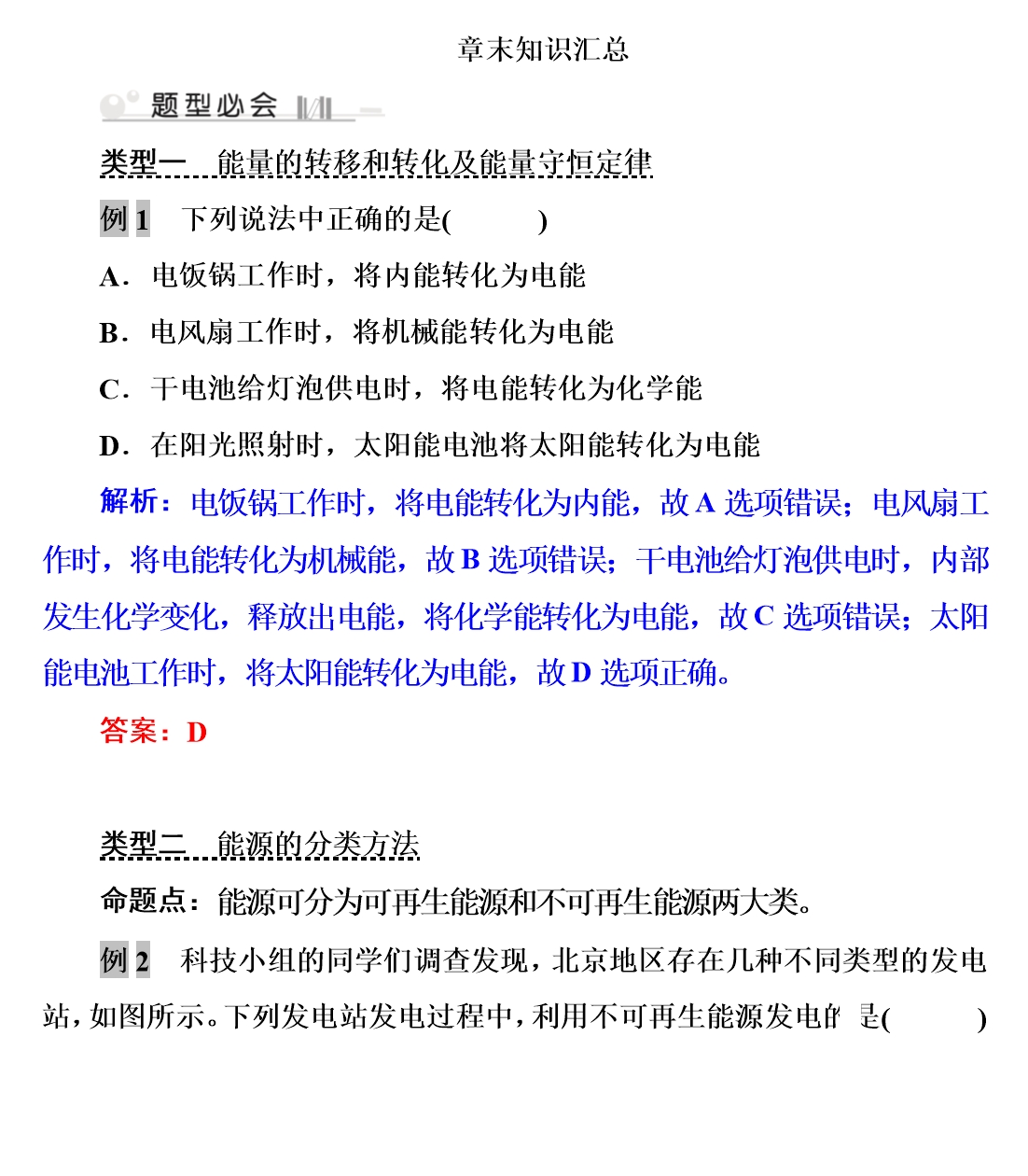 【内容简介】类型一 能量的转移和转化及能量守恒定律例1 下列说法中正确的是( )A.电饭锅工作时,将内能转化为电能B.电风扇工作时,将机械能转化为电能C.干电池给灯泡供电时,将电能转化为化学能D.在阳光照射时,太阳能电池将太阳能转化为电能解析:电饭锅工作时,将电能转化为内能,故A选项错误;电风扇工作时,将电能转化为机械能,故B选项错误;干电池给灯泡供电时,内部发生化学变化,释放出电能,将化学能转化为电能,故C选项错误;太阳能电池工作时,将太阳能转化为电能,故D选项正确。答案:D类型二 能源的分类方法命题点:能源可分为可再生能源和不可再生能源两大类。例2 科技小组的同学们调查发现,北京地区存在几种不同类型的发电站,如图所示。下列发电站发电过程中,利用不可再生能源发电的是( ) 解析:煤,石油、天然气等化石能源使用之后在短时间内不能再次产生,属于不可再生能源,所以燃气电站利用不可再生能源发电,故A选项符合题意;太阳能、水能、风能等使用之后可以在短时间内从自然界中再次产生,属于可再生能源,所以风电站、水电站、太阳能电站是利用可再生能源发电的。故B、C、D选项不符合题意。答案:A类型三 材料的选择及应用命题点:1.力的作用效果;2.密度;3.新材料。........