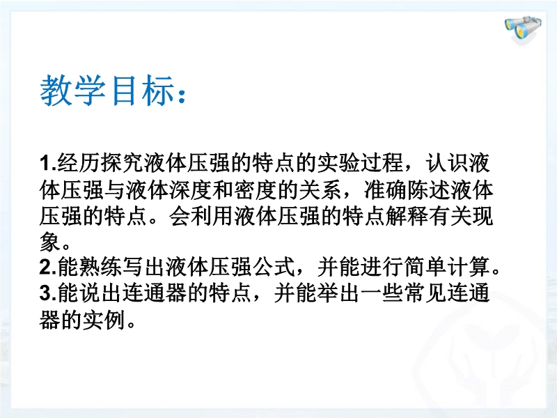 【内容简介】1.经历探究液体压强的特点的实验过程,认识液体压强与液体深度和密度的关系,准确陈述液体压强的特点。会利用液体压强的特点解释有关现象。2.能熟练写出液体压强公式,并能进行简单计算。3.能说出连通器的特点,并能举出一些常见连通器的实例。