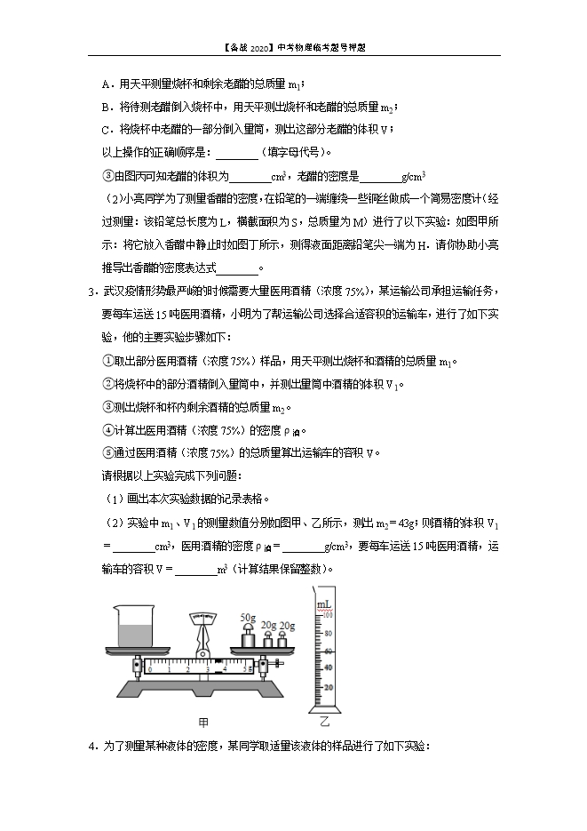 【内容简介】小明使用天平测小石块的质量。测量前,他将天平放在水平桌面上,然后进行天平横梁平衡的调节。调节完成后指针静止时的位置和游码的位置如图甲所示。 (1)请你指出小明调节天平横梁平衡的过程中遗漏的操作步骤:________;(2)完成遗漏的操作步骤后,为了调节横梁平衡,他需向________(选填“左”或“右”)调节平衡螺母,使指针指到分度盘中央刻度线或在中央刻度线两侧等幅摆动;(3)调节横梁平衡后,小明将小石块放在左盘,在右盘中加减砝码并调节游码在标尺上的位置,直到横梁恢复平衡。这时右盘中的砝码情况和游码在标尺上的位置如图乙所示,则小石块的质量为________g。【答案】(1)游码调零;(2)右;(3)78.4。【解析】(1)使用天平时,应先把游码移到标尺的零刻度线处,即游码归零,再调节平衡螺母使天平平衡,而小明调节天平横梁平衡的过程中遗漏了游码归零这一步骤。(2)甲图中没有将游码移至零刻度线,横梁就平衡了,如果将游码调零,则指针会偏向分度盘左侧,此时要使横梁平衡,则应将平衡螺母向右调节;(3)由图知,小石块的质量m=50g+20g+5g+3.4g=78.4g。 小娜想要用天平和量筒测量一种玻璃水的密度。(1)把天平放在水平台上,发现游码未归零时天平已平衡。小娜立即将游码归零,现在为了使天平再次平衡,小娜应向________(左/右)调节平衡螺母,使天平平衡。(2)小娜使用调好的天平测量烧杯与玻璃水的总质量,砝码克数和游码在标尺上的位置如图甲所示,其质量为________g。(3)将烧杯中玻璃水一部分倒入量筒中,量筒中液面位置如图乙,用天平测量烧杯与剩余玻璃水的总质量为38g,则玻璃水的密度为________kg/m3。(4)在两次测量质量时,同组同学发现小娜都使用了同一个磨损了的砝码,则使测量玻璃水密度的结果________(选填“偏大”、“偏小”或“保持不变”)。 【答案】(1)右;(2)93;(3)1.1×103;(4)保持不变。【解析】(1)把天平放在水平台上,发现游码未归零时天平已平衡。当游码归零,天平右端上翘,为了使天平再次平衡,小娜应向右调节平衡螺母,使天平平衡;(2)小娜使用调好的天平测量烧杯与玻璃水的总质量,砝码克数和游码在标尺上的位置如图甲所示,其质量m=50g+20g+20g+3g=93g;(3)量筒中液面位置如图乙所示,则量筒中玻璃水的体积V=50mL=50cm3,由已知条件可以得出量筒内液体的质量m1=93g﹣38g=55g,则玻璃水的密度为:ρ= = =1.1g/cm3=1.1×103kg/m3;(4)使用磨损的砝码会使读出的物质质量偏大,但是在此实验中我们是将两次实验结果相减来计算量筒内的质量,所以对最后的质量不会有影响,所以对求玻璃水的密度液不会有任何影响。......