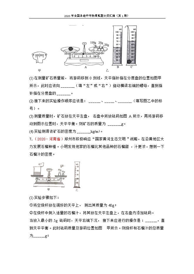 【内容简介】一、选择题1.(2020•四川省成都市)下列测量方案中,最合理的是( )A. 测小铁块密度:用装有适量水的量筒测体积后,再用天平测质量B. 测正方体小木块密度:用天平测质量后,再用刻度尺测边长并计算体积C. 测小砖块密度:用天平测质量后,再用装有适量水的量筒测体积D. 测比赛用铅球密度:用天平测质量后,再用装有适量水的量筒测体积【答案】B【解析】【详解】A.测小铁块密度:用装有适量水的量筒测体积后,再用天平测质量,会因为铁块沾到水,导致测量质量偏大,故A不合理;B.测正方体小木块密度:用天平测质量后,再用刻度尺测边长并计算体积,测量过程没有出现问题,故B合理;C.测小砖块密度:用天平测质量后,再用装有适量水的量筒测体积,砖块有小孔,放入水中会储存气泡,导致测量体积偏大,故C不合理;D.测比赛用铅球密度:用天平测质量会超过天平最大测量值,无法测量,故D不合理。故选B。2.(2020•山东省泰安市)电子秤有“清零”功能,例如,在电子秤上放200g砝码,电子秤显示为200g,按清零键后,显示变为零;随后再放上100g砝码,电子秤显示为100g。利用电子秤的这种功能,结合物理知识可测定玉镯的密度。具体操作如下:步骤a:向烧杯内倒入适量水,放在电子秤上,按清零键,显示数变为零;步骤b:手提细线拴住玉镯,浸没在水中,且不与烧杯底和壁接触,记下此时电子秤示数为m1;步骤c:把玉镯接触杯底,手放开细线,记下此时电子秤示数为m2。则下列判断中( ) ①玉镯的质量为m1 ②玉镯的质量为m2③玉镯的密度为 ④玉镯的密度为 A. 只有①③正确B. 只有①④正确C. 只有②③正确D. 只有②④正确【答案】C【解析】【详解】①②向烧杯内倒入适量水,放在电子秤上,按清零键,显示数变为零,说明原来水和烧杯的总质量设为零,把玉镯接触杯底,手放开细线,总质量是m2,所以玉镯的质量为m2,故①错误,②正确;③④玉镯排开水的质量m排=m1玉镯全部浸入水中,玉镯的体积V=V排= 玉镯的密度ρ= 故③正确,④错误。故选C。3.(2020•湖南省常德市)一个钢瓶内装有密度为6kg/m3的氧气,某次抢救新冠病人用去了其质量的三分之一,钢瓶内剩余氧气的密度为( )A. 6kg/m3B. 4kg/m3C. 3kg/m3D. 2kg/m3【答案】B【解析】【详解】钢瓶内剩余氧气的体积与使用之前的体积一样,质量变为原来的 ,由 可知,钢瓶内剩余氧气的密度变为原来的 ,即 故选B。二、填空4.(2020•湖南省常德市) (2) 图乙所示天平测得物体 质量是______g; 【答案】 (2). 76.6 【解析】【详解】(2)[2]如图乙所示,天平标尺分度值为0.2g,则物体的质量为m=50g+20g+5g+1.6g=76.6g三、实验题5.(2020•江苏省泰州市)为做好消毒防疫,学校给各班准备了一些瓶装的75%消毒酒精。小明所在的物理兴趣小组围绕这些消毒酒精开展下列活动。(1)把天平放在水平台面上,先将________,再调节平衡螺母,使指针对准分度盘中央的刻度线;接着小明用天平测出瓶酒精的总质量为96.2g,再将部分酒精倒入量筒中,液面如图甲所示:最后用天平测出剩余酒精和瓶的总质量,测量结果如图乙所示,天平的读数为________g,75%消毒酒精的密度为________g/cm3;