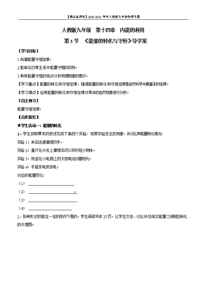 【精品备课包】2020-2021学年人教版九年级物理专题:14.3能量的转化和守恒(课件 教案 导学案 同步练习)