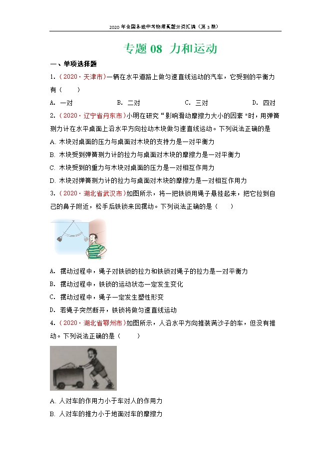 【内容简介】1.(2020•天津市)一辆在水平道路上做匀速直线运动的汽车,它受到的平衡力有( )A. 一对B. 二对C. 三对D. 四对【答案】B【解析】【详解】因汽车做匀速直线运动,处于平衡状态,受平衡力作用,在水平方向上,受牵引力和阻力的作用,两个力作用于汽车,大小相等,方向相反,作用于同一条直线,是一对平衡力;在竖直方向,受重力和水平面对汽车的支持力作用,两个力作用于汽车,大小相等,方向相反,作用于同一条直线,是一对平衡力;故汽车受二对平衡力的作用。故选B。2.(2020•辽宁省丹东市)小明在研究“影响滑动摩擦力大小的因素"时,用弹簧测力计在水平桌面上沿水平方向拉动木块做匀速直线运动。下列说法正确的是A. 木块对桌面的压力与桌面对木块的支持力是一对平衡力B. 木块受到弹簧测力计的拉力与桌面对木块的摩擦力是一对平衡力C. 木块受到的重力与木块对桌面的压力是一对相互作用力D. 木块对弹簧测力计的拉力与桌面对木块的摩擦力是一对相互作用力【答案】B【解析】【详解】A.木块对桌面的压力与桌面对木块的支持力,两个力作用于不同的物体,故不是平衡力,故A错误;B.因木块做匀速直线运动,木块处于平衡状态,受平衡力的作用,故在水平方向木块受到弹簧测力计的拉力与桌面对木块的摩擦力,作用于同一物体,两个力的大小相等、方向相反,作用于同一条直线,故是一对平衡力,故B正确;C.木块受到的重力与木块对桌面的压力,两个方向相同,故不是相互作用力,故C错误;D.木块对弹簧测力计的拉力与桌面对木块的摩擦力,两个力方向相同、作用于不同物体,不是一对相互作用力,故D错误。故选B。3.(2020•湖北省武汉市)如图所示,将一把铁锁用绳子悬挂起来,把它拉到自己的鼻子附近,松手后铁锁来回摆动。下列说法正确的是( ) A. 摆动过程中,绳子对铁锁的拉力和铁锁对绳子的拉力是一对平衡力B. 摆动过程中,铁锁的运动状态一定发生变化C. 摆动过程中,绳子一定发生塑性形变D. 若绳子突然断开,铁锁将做匀速直线运动【答案】B【解析】【详解】A.摆动过程中,绳子对铁锁的拉力和铁锁对绳子的拉力是相互作用力,故A错误;B.摆动过程中,铁锁的运动速度和运动方向在发生改变,即运动状态在发生改变,故B正确;C.摆动过程中,绳子发生弹性形变,故C错误;D.若绳子突然断开,铁锁由于重力作用,不处于平衡状态,故不做匀速直线运动,故D错误。故选B。4.(2020•湖北省鄂州市)如图所示,人沿水平方向推装满沙子的车,但没有推动。下列说法正确的是( )