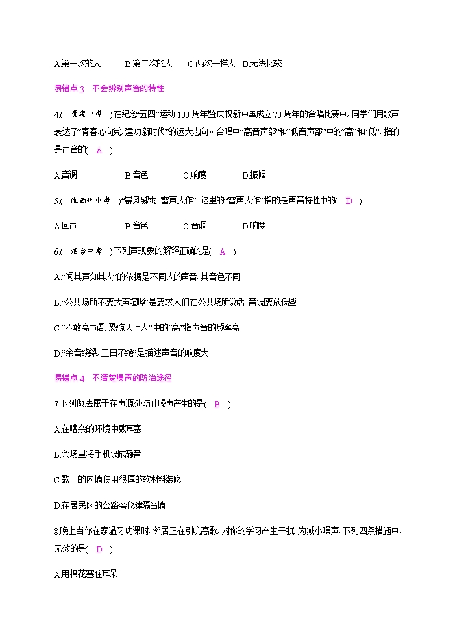 【内容简介】易错点1 不清楚声音的产生1.某学习小组做了下列的实验和实例:①在鼓面上放些碎纸屑,敲鼓时可观察到纸屑在不停地跳动;②放在真空罩里的手机当来电时,只见指示灯闪烁,听不见铃声;③拿一张硬纸片,让它在木梳齿上划过,一次快些,一次慢些,比较两次声音的不同;④锣发声时用手按住锣,锣声就消失了。其中研究声音产生的一组实验是( B )A.①②B.①④ C.②③D.③④易错点2 不清楚声音的传播2.下列声现象中,能说明声音的传播需要介质的是( D ) 3.用牙轻轻咬住铅笔上端,用手指轻轻敲笔下端,注意听这个敲击声。然后张开嘴使牙不接触铅笔上端,而保持铅笔位置不变,手指用与前一次同样的力轻敲铅笔下端。比较两次听到声音的大小是( A )A.第一次的大B.第二次的大 C.两次一样大D.无法比较易错点3 不会辨别声音的特性4.( 贵港中考 )在纪念“五四”运动100周年暨庆祝新中国成立70周年的合唱比赛中,同学们用歌声表达了“青春心向党,建功新时代”的远大志向。合唱中“高音声部”和“低音声部”中的“高”和“低”,指的是声音的( A )A.音调B.音色C.响度D.振幅 5.( 湘西州中考 )“暴风骤雨,雷声大作”,这里的“雷声大作”指的是声音特性中的( D )A.回声B.音色C.音调D.响度6.( 烟台中考 )下列声现象的解释正确的是( A )A.“闻其声知其人”的依据是不同人的声音,其音色不同B.“公共场所不要大声喧哗”是要求人们在公共场所说话,音调要放低些C.“不敢高声语,恐惊天上人”中的“高”指声音的频率高D.“余音绕梁,三日不绝”是描述声音的响度大易错点4 不清楚噪声的防治途径