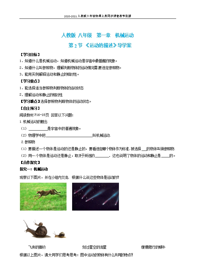 - 1342024-2025新人教版八年级物理上册导学案:1.2《运动的描述》导学案