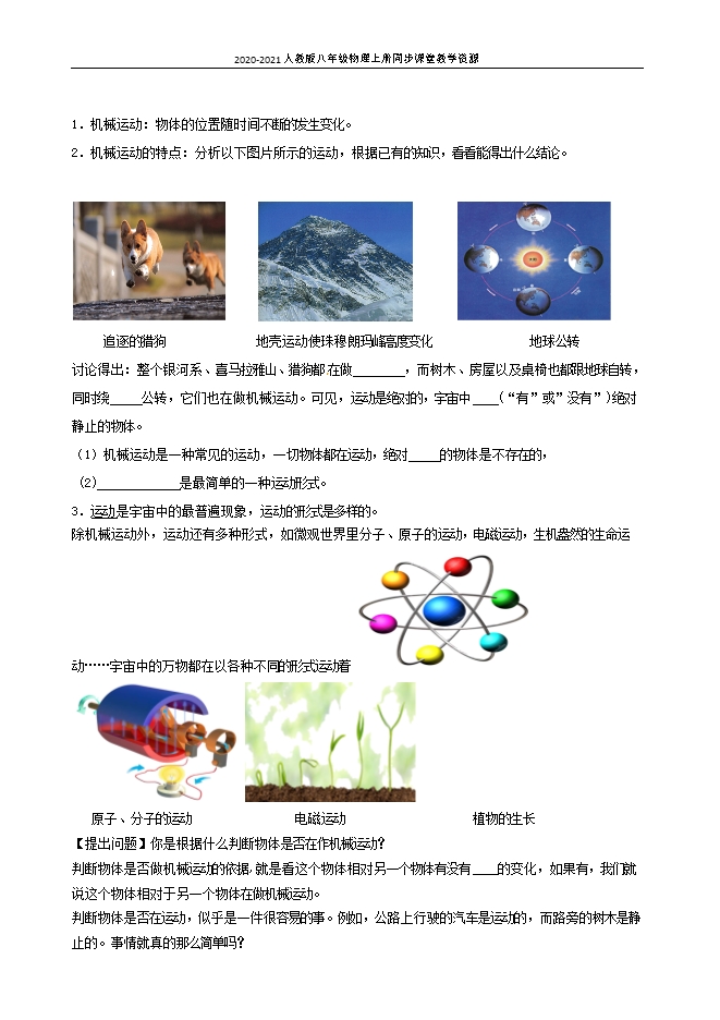 【内容简介】师:同学们知道有个成语故事《刻舟求剑》吗?谁来给大家讲一下?学生:一个楚国人坐船过江,船到江心时,他一不小心把心爱的宝剑掉到了水里。那人马上掏出一把小刀,在船舷上刻上个记号,并说:“这是宝剑落水的地方,所以我要刻上一个记号”。船靠岸以后,他请船夫从他刻了记号的船边下水,替他打捞宝剑。师:船夫可能找 到剑 吗? 新课学习一、机械运动【想想议议】:同学们一起讨论课本图1.2-1所示的物体的运动,想想看,根据什么说这些物体是运动的? 哈雷彗星大约每隔76年就到地球附近造访一次 飞奔的猎豹 缓慢爬行的蜗牛 翱翔的鸽子划过的彗星、奔驰的火车、飞奔的猎豹、缓慢爬行的蜗牛、翱翔的鸽子……这些运动的物体都有一个共同特点,就是他们的位置随时间不断发生变化。1. 机械运动:物理学中,我们把物体位置的变化叫做机械运动。(1)机械运动是一种常见的运动,也是最简单的一种运动形式。 街上的行人 奔腾的骏马 地球的公转 江河奔流 地壳运动 天体运动我们身边的一切物体都在运动,平时认为不动的房屋、树木等随地球而转,同时绕太阳公转,整个太阳系、乃至整个银河系及宇宙,也都不停地运动。可见,运动是宇宙中最普遍的运动,绝对不动的物体是没有的。(2)运动是宇宙中最普遍的现象,除了机械运动,运动还有多种形式。除机械运动外,运动还有多种形式,如微观世界里分子、原子的运动,电磁运动,生机盎然的生命运动……宇宙中的万物都在以各种不同的形式运动着。 原子、分子的运动 电磁运动 植物的生长【提出问题】你是根据什么判断物体是否在在运动?要判断物体是否在运动,似乎是一件很容易的事。例如,公路上行驶的汽车是运动的,而路旁的树木是静止的。事情就真的那么简单吗?【想想议议】你也许有这样的体验:两列火车并排停在站台上,你坐在甲车车厢向乙车车厢观望,突然你觉得自己坐的火车开始缓缓地前进了,但是,“驶过”了旁边乙车的车尾你才发现,实际上甲车还停在站台上,而旁边的乙车却向相反的方向开走了。这是怎么回事? 这是因为:你被乙车挡住视线,看不到周围的建筑物或地面,你坐的车和乙车比较,你和乙车的位置变化了,所以你觉得自己的车运动了,等到乙车驶过,你看到了地面或站台建筑物,你才觉得你没动,而且看到乙车车尾,和地面比较,你觉得乙车和刚才自己感觉到的的方向相反。也就是说,你在判断自己所在的甲车的运动情况时,甲车和乙车比较、甲车和地面比较。运动结果是不一样的。由此我们可以知道:要描述物体的运动,要确定一个标准,与这个标准比较,如果一个物体的位置相对这个标准发生了变化,就说它是运动的;如果没有变化,就说它是静止的。这个作为标准的物体叫参照物。二、参照物1.参照物:在描述物体的运动时,被选作标准的物体叫做参照物。(1)参照物的选定可以是任意的,运动和静止的物体都可以作为参照物,物体本身不能做参照物。现在一起来看看有关太阳、地球、卫星的运动和静止问题:①我们通常所说的“太阳东升西落”,是以谁为参照物呢?(答案:地球)②而地理学科中所说的“地球绕着太阳转”又是以谁为参照物呢?(答案:太阳)③地球同步卫星与地球一起在做同步运动,如果以地球为参照物,地球同步卫星是运动还是静止?(答案:静止)总结:由此可见,判断物体是运动还是静止,有两个步骤,一看选哪个物体作为参照物,二看被判断物体与参照物之间是否发生位置变化。如果位置变化了,是运动的;如果位置没有变化,是静止的。(2)参照物一旦被选定,我们就假定该物体是静止的。(3)一般选地面或地面上静止的物体作为参照物。生活中一般以地面为参照物时,往往不说明。(4)描述同一物体的运动时,选择的参照物不同,结论一般不同。【做一做】请同学们将小车放在课桌上,再将钩码放在小车上,用手缓慢地推动小车,使小车载着钩码沿桌面向前移动,观察并思考:(1)如果以桌面为参照物,小车是运动的还是静止的?(答案:运动)(2)如果以桌面为参照物,钩码是运动的还是静止的?(答案:运动)(3)如果以小车为参照物,钩码是运动的还是静止的?(答案:静止)通过分析,让学生明确同一研究对象钩码,选择桌面和小车为参照物,运动状态不一样,可见运动和静止具有相对性。总结:同一物体是运动还是静止取决于所选参照物。这叫做运动和静止的相对性。三、运动和静止的相对性(1)一个物体是运动还是静止取决于所选参照物。运动是绝对的,但在描述物体的运动时,运动又是相对的,相对于参照物来说的。静止都是相对的。【提出问题】以同样快慢、向同一方向前进的卡车和联合收割机以什么为参照物它们是运动的,以什么为参照物,卡车或联合收割机是静止的。为什么? 如果以地面为参照物,他们都是运动的;以他们中的任何一个为参照物。则另一个是静止的。(2)相对静止:如果两个物体的运动快慢相同、运动的方向相同,则这两个物体相对静止。【想想议议】甲、乙两图中自动扶梯上的人与战机选什么样的参照物是运动的,选什么样的参照物是静止的? 甲 乙甲图中的人以地面为参照物是运动的,以扶梯为参照物是静止的;乙图中的战机乙地面为参照物是运动的;以加油机为参照物是静止的。【拓展】1第一次世界大战期间,一名法国飞行员,在两千米高空飞行时,发现有一个小虫似的东