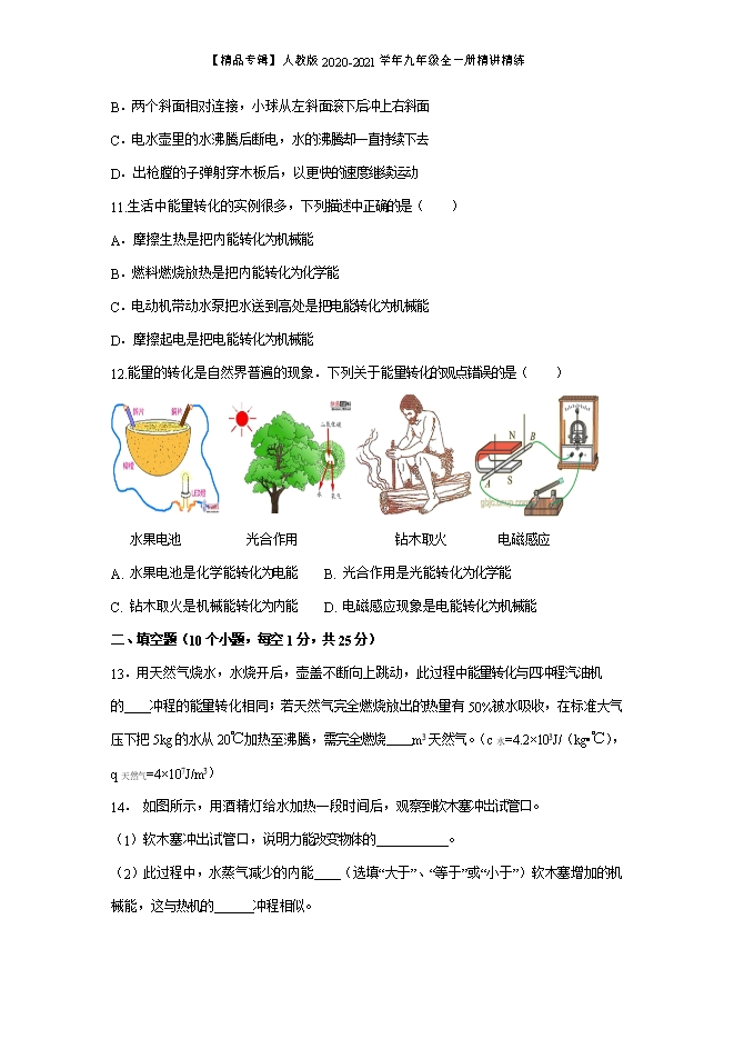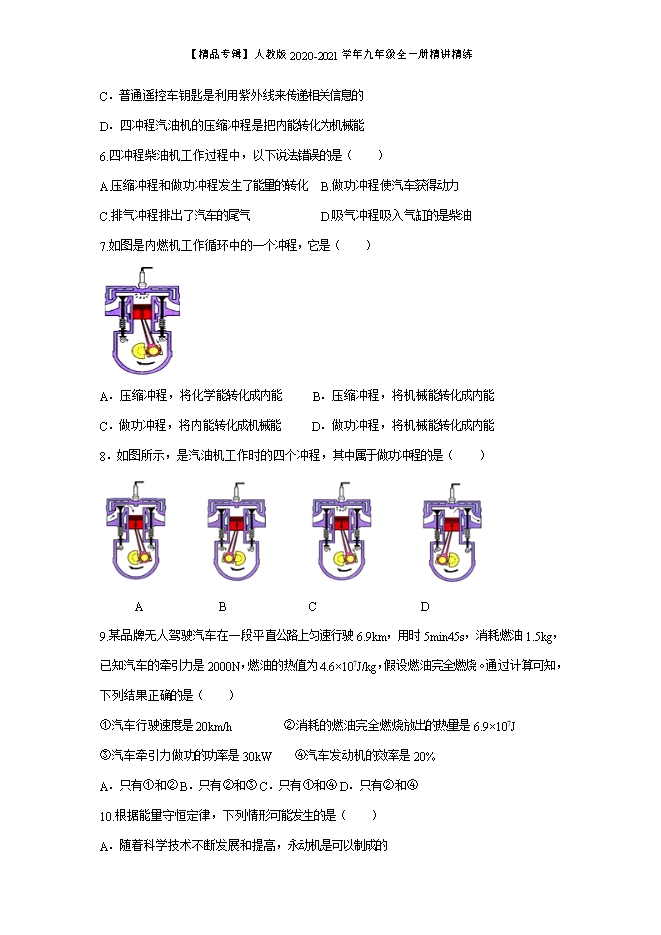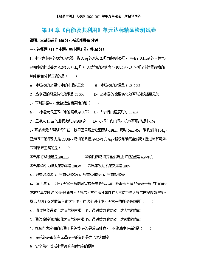 【内容简介】一、选择题(12个小题,每小题3分,共36分)1.小李家使用的燃气热水器,将30kg的水从20℃加热到45℃,消耗了0.15m3的天然气。已知水的比热容为4.2×103J/(kg℃),天然气的热值为4×107J/m3,则下列与该过程有关的计算结果和分析正确的是( )A.水吸收的热量与水的末温成正比 B.水吸收的热量是3.15×105JC.热水器的能量转化效率是52.5% D.热水器的能量转化效率与环境温度无关【答案】C【解析】A.由Q吸=cm(t﹣t0)知,水吸收的热量与水的质量和升高的温度成正比,故A错误;B.将30kg的水从20℃加热到45℃,水吸收的热量:Q吸=cm(t﹣t0)=4.2×103J/(kg℃)×30kg×(45℃﹣20℃)=3.15×106J,故B错误;C.天然气完全燃烧放出热量:Q放=V天然气q=0.15m3×4×107J/m3=6×106J,热水器的能量转化效率:η= Q吸 / Q放×100%=52.5%,故C正确;D.热水器的能量转化效率与环境温度有关,因为环境温度越低,加热的时间越长,其散失的热量越多,则热水器的能量转化效率越低,故D错误。2.下列数据中,最接近生活实际的是( )A.一标准大气压下,冰的熔点为37℃ B.人步行的速度约为1.1m/sC.正常人1min的脉搏数约为200次 D.小汽车内的汽油机效率可以达到95%【答案】B.【解析】首先对题目中涉及的物理量有个初步的了解,对于选项中的单位,可根据需要进行相应的换算或转换,排除与生活实际相差较远的选项,找出符合生活实际的答案.A.一标准大气压下,冰的熔点为0℃,故A错误;B.人正常步行的速度在4km/h=4× m/s≈1.1m/s左右.故B正确;C.人的脉搏在每分钟60次多一点,与每分钟70次接近,故C错误;D.汽油机的效率在30%左右,绝达不到95%,因为克服摩擦、尾气带走许多内能,故D错误.3.某品牌无人驾驶汽车在一段平直公路上匀速行驶6.9km,用时5min45s,消耗燃油1.5kg,已知汽车的牵引力是2000N,燃油的热值为4.6×107J/kg,假设燃油完全燃烧。通过计算可知,下列结果正确的是( )①汽车行驶速度是20km/h ②消耗的燃油完全燃烧放出的热量是6.9×107J③汽车牵引力做功的功率是30kW ④汽车发动机的效率是20%A.只有①和②B.只有②和③C.只有①和④D.只有②和④【答案】D【解析】(1)已知汽车行驶的时间和路程,利用速度公式即可求解;(2)根据Q放=mq可求热量;(3)根据车受到的阻力为车重的0.1倍求得车受到的阻力,因为匀速行驶,所以牵引力等于阻力,利用W=Fs可求得该汽车牵引力所做的功,再利用P= 求功率;(4)根据燃油密度和体积求得其质量,利用Q=mq可求得消耗的总能量,再利用效率公式求出该汽车的效率。①汽车的行驶速度:v= = =72km/h,故①错误;(2)消耗的燃油完全燃烧放出的热量:Q放=mq=1.5kg×4.6×107J/kg=6.9×107J,故②正确;(3)因为匀速行驶,所以汽车受到的牵引力:F=f=2×103N,该汽车牵引力所做的功:W=Fs=2×103N×6.9×103m=1.38×107J,该汽车牵引力所做功的功率:P= = =40000W=40kW,故③错误;(4)汽车消耗燃油的产生的热量:Q放=mq=1.5kg×4.6×107J/kg=6.9×107J,该汽车的效率:η= = ×100%=20%,故④正确。4. 2018年4月2日,天宫一号圆满完成预定任务后返回地球。8.5t重的天宫一号,在100km左右的高空以约22倍音速再入大气层。其中部分器件在大气层中与大气层摩擦烧蚀销毁。最后大约1.5t残骸坠入南太平洋。在这个过程中,天宫一号的部分机械能( )A.通过热传递转化为大气的内能 B.通过重力做功转化为大气的内能C.通过摩擦做功转化为大气的内能 D.通过重力做功转化为残骸的内能【答案】D【解析】改变内能的方法有两个:做功和热传递,据此分析。天宫一号在100km左右的高空以约22倍音速再入大气层时,高度减小,重力势能减小,克服与大气的摩擦做功,机械能转化为内能。故D正确。