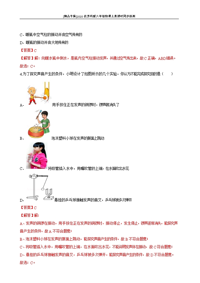 【内容简介】一、单选题(共9小题)1.关于声音的发生,正确的说法是( )A.物体振动停止后还会发出很弱的声音B.正在发声的物体都在振动C.只要物体振动,我们就能听到声音D.振动停止,物体的发声并不停止【答案】B【解答】解:ABD、一切正在发声的物体都在振动,振动停止后发声也停止,故AD错误,B正确;B、物体振动能够产生声音,但是产生的声音不一定被人听到,只有频率在人耳听觉范围内的声音才能被人耳听到,即使在人耳听觉范围内的声音,如果没有传播声音的介质,人也是无法听到的,故C错误;故选:B。2.关于声音的传播下列说法不正确的是( )A.声音借助介质以波的形式传播B.声音的传播可以没有介质C.声音的传播速度一般随介质的不同而不同D.声音的传播速度与介质种类和温度有关【答案】B【解答】解:A、声音借助介质以波动形式传播,故A正确,不符合题意;B、声音的传播需要介质,声音不能在真空中传播,故B错误,符合题意;C、不同介质声音的传播速度不同,故C正确,不符合题意;D、声音的传播速度跟介质的种类和温度有关。故D正确,不符合题意;故选:B。3.往暖瓶中倒开水,你听到的声音是( )A.暖瓶的振动并由空气传来的B.暖瓶中水的振动并由暖瓶传来的C.暖瓶中空气柱的振动并由空气传来的D.暖瓶的振动并由大地传来的【答案】C【解答】解:向暖水瓶中倒水,是瓶内空气柱振动发声,并通过空气传出来,故C正确,ABD错误。故选:C。4.为了探究声音产生的条件,小明设计了如图所示的几个实验,你认为不能完成探究目的是( )A. 用手按住正在发声的铜锣时,锣声就消失了B. 泡沫塑料小球在发声的鼓面上跳动C. 将吸管插入水中,用嘴吹管的上端,在水面吹出水花D. 悬挂的乒乓球接触发声的音叉,乒乓球被多次弹开【答案】C【解答】解:A、发声的铜锣在振动,用手按住正在发声的铜锣时,振动停止,发生停止,锣声逐渐消失,能探究声音产生的条件,故A不符合题意;B、泡沫塑料小球在发声的鼓面上跳动,能探究声音产生的条件,故B不符合题意;C、将吸管插入水中,用嘴吹管的上端,在水面吹出水花,不能说明发声体在振动,故C符合题意;D、悬挂的乒乓球接触发声的音叉,乒乓球被多次弹开,能探究声音产生的条件,故D不符合题意。故选:C。5.下列关于声音的说法不正确的是( )A.有些高科技产品不振动也可发声B.水中倒立的花样游泳运动员随着音乐表演,说明水能传播声音C.敲击暖气管,暖气管能把敲击声传遍楼内各处,说明固体能传播声音D.在同一宇宙飞船的太空舱内,两名宇航员可以直接对话【答案】A【解答】解:A、声音是由物体的振动产生的,不振动不能发出声音,故A错误;B、花样游泳运动员在水中表演时,能听到岸上优美的音乐声,说明液体(水)也能传播声音,故B正确;C、暖气管能把敲击声传遍楼内各处,说明固体能传播声音,故C正确;D、宇宙飞船的太空舱内充满空气,所以在同一宇宙飞船的太空舱内,两名宇航员可以直接对话,故D正确。故选:A。